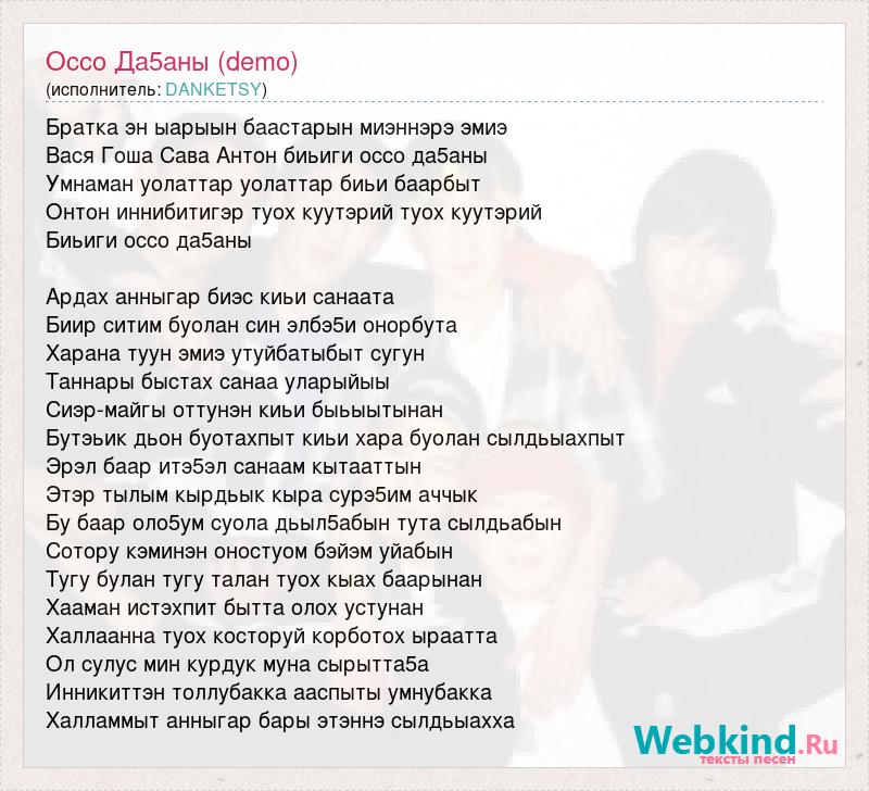 Братка эн ыарыын баастарын миэннэрэ эмиэ Вася Гоша Сава Антон биьиги оссо да5аны Умнаман уолаттар уолаттар биьи баарбыт Онтон иннибитигэр туох куутэрий туох куутэрий Биьиги оссо да5аны Ардах анныгар биэс киьи санаата Биир ситим буолан син элбэ5и онорбута Харана туун эмиэ утуйбатыбыт сугун Таннары быстах санаа уларыйыы Сиэр-майгы оттунэн киьи быьыытынан Бутэьик дьон буотахпыт киьи хара буолан сылдьыахпыт Эрэл баар итэ5эл санаам кытааттын Этэр тылым кырдьык кыра сурэ5им аччык Бу баар оло5ум суола дьыл5абын тута сылдьабын Сотору кэминэн оностуом бэйэм уйабын Тугу булан тугу талан туох кыах баарынан Хааман истэхпит бытта олох устунан Халлаанна туох косторуй корботох ыраатта Ол сулус мин курдук муна сырытта5а Инникиттэн толлубакка ааспыты умнубакка Халламмыт анныгар бары этэннэ сылдьыахха