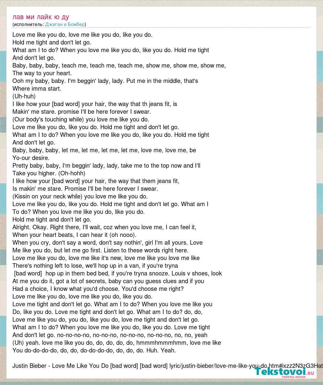 Love me like you do, love me like you do, like you do. Hold me tight and don't let go. What am I to do? When you love me like you do, like you do. Hold me tight And don't let go. Baby, baby, baby, teach me, teach me, teach me, show me, show me, show me, The way to your heart. Ooh my baby, baby. I'm beggin' lady, lady. Put me in the middle, that's Where imma start. (Uh-huh) I like how your [bad word] your hair, the way that th jeans fit, is Makin' me stare. promise I'll be here forever I swear. (Our body's touching while) you love me like you do. Love me like you do, like you do. Hold me tight and don't let go. What am I to do? When you love me like you do, like you do. Hold me tight And don't let go. Baby, baby, baby, let me, let me, let me, let me, love me, love me, be Yo-our desire. Pretty baby, baby, I'm beggin' lady, lady, take me to the top now and I'll Take you higher. (Oh-hohh) I like how your [bad word] your hair, the way that them jeans fit, Is makin' me stare. Promise I'll be here forever I swear. (Kissin on your neck while) you love me like you do. Love me like you do, like you do. Hold me tight and don't let go. What am I To do? When you love me like you do, like you do. Hold me tight and don't let go. Alright. Okay. Right there, I'll wait, coz when you love me, I can feel it, When your heart beats, I can hear it (oh nooo). When you cry, don't say a word, don't say nothin', girl I'm all yours. Love Me like you do, but let me go first. Listen to these words right here. Love me like you do, love me like it's new, love me like you love me like There's nothing left to lose, we'll hop up in a van, if you're tryna [bad word] hop up in them bed bed, if you're tryna snooze. Louis v shoes, look At me you do it, got a lot of secrets, baby can you guess clues and if you Had a choice, I know what you'd choose. You'd choose me right? Love me like you do, love me like you do, like you do. Love me tight and don't let go. What am I to do? When you love me like you Do, like you do. Love me tight and don't let go. What am I to do? do, do, Love me like you do, you do, like you do, love me tight and don't let go. What am I to do? When you love me like you do, like you do. Love me tight And don't let go. no-no-no-no, no-no-no, no-no-no, no-no-no, no, no, yeah (Uh) yeah. love me like you do, do, do, do, do, hmmmhmmmhmm, love me like You do-do-do-do, do, do, do-do-do-do, do, do, do. Huh. Yeah. Justin Bieber - Love Me Like You Do [bad word] [bad word] lyric/justin-bieber/love-me-like-you-do.htm#ixzz2N3zG3Hat