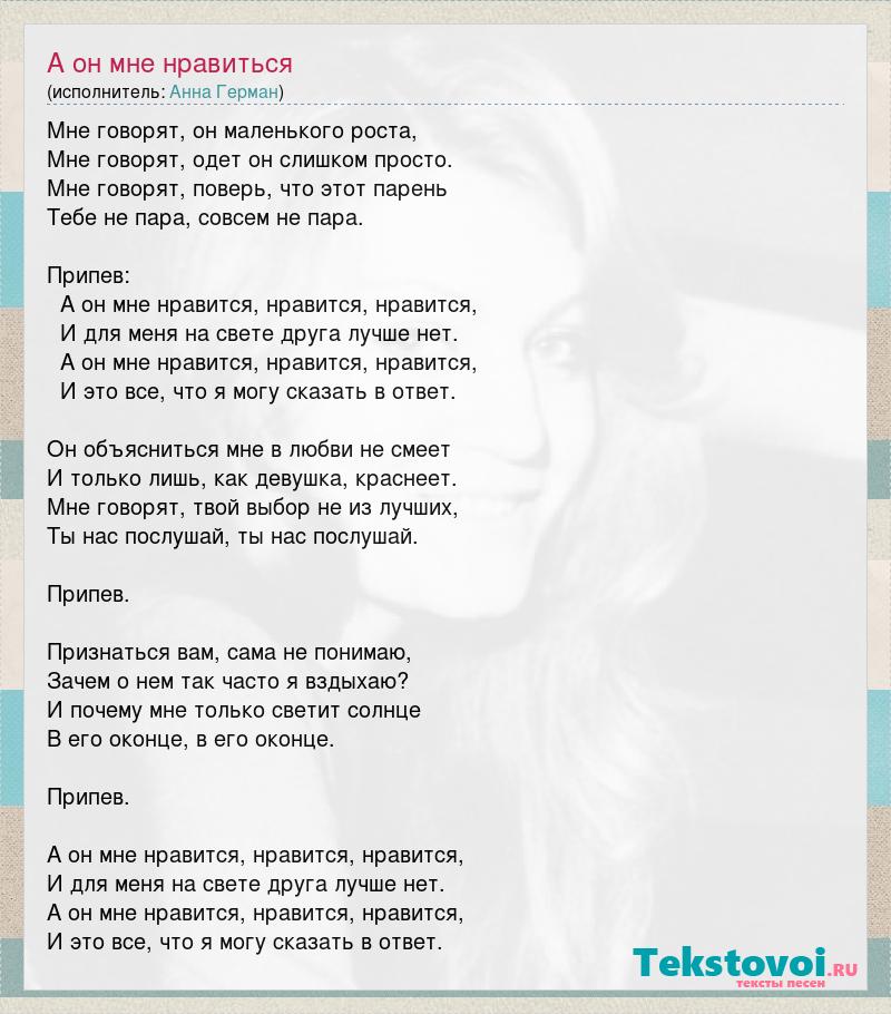 Мне говорят, он маленького роста, Мне говорят, одет он слишком просто. Мне говорят, поверь, что этот парень Тебе не пара, совсем не пара. Припев: А он мне нравится, нравится, нравится, И для меня на свете друга лучше нет. А он мне нравится, нравится, нравится, И это все, что я могу сказать в ответ. Он объясниться мне в любви не смеет И только лишь, как девушка, краснеет. Мне говорят, твой выбор не из лучших, Ты нас послушай, ты нас послушай. Припев. Признаться вам, сама не понимаю, Зачем о нем так часто я вздыхаю? И почему мне только светит солнце В его оконце, в его оконце. Припев. А он мне нравится, нравится, нравится, И для меня на свете друга лучше нет. А он мне нравится, нравится, нравится, И это все, что я могу сказать в ответ.
