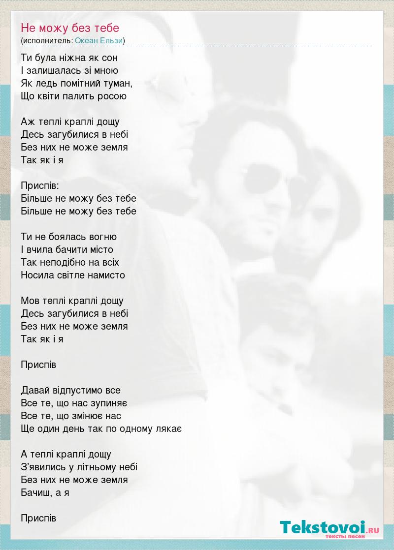 Ти була ніжна як сон І залишалась зі мною Як ледь помітний туман, Що квіти палить росою Аж теплі краплі дощу Десь загубилися в небі Без них не може земля Так як і я Приспів: Більше не можу без тебе Більше не можу без тебе Ти не боялась вогню І вчила бачити місто Так неподібно на всіх Носила світле намисто Мов теплі краплі дощу Десь загубилися в небі Без них не може земля Так як і я Приспів Давай відпустимо все Все те, що нас зупиняє Все те, що змінює нас Ще один день так по одному лякає А теплі краплі дощу З’явились у літньому небі Без них не може земля Бачиш, а я Приспів