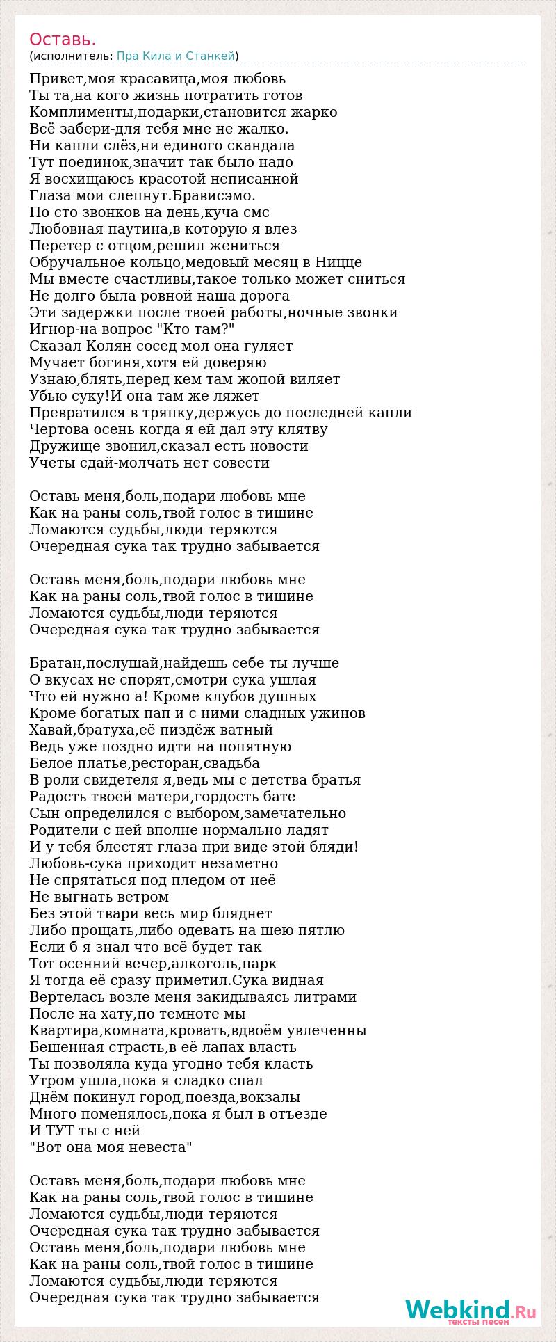 Привет,моя красавица,моя любовь Ты та,на кого жизнь потратить готов Комплименты,подарки,становится жарко Всё забери-для тебя мне не жалко. Ни капли слёз,ни единого скандала Тут поединок,значит так было надо Я восхищаюсь красотой неписанной Глаза мои слепнут.Брависэмо. По сто звонков на день,куча смс Любовная паутина,в которую я влез Перетер с отцом,решил жениться Обручальное кольцо,медовый месяц в Ницце Мы вместе счастливы,такое только может сниться Не долго была ровной наша дорога Эти задержки после твоей работы,ночные звонки Игнор-на вопрос "Кто там?" Сказал Колян сосед мол она гуляет Мучает богиня,хотя ей доверяю Узнаю,блять,перед кем там жопой виляет Убью суку!И она там же ляжет Превратился в тряпку,держусь до последней капли Чертова осень когда я ей дал эту клятву Дружище звонил,сказал есть новости Учеты сдай-молчать нет совести Оставь меня,боль,подари любовь мне Как на раны соль,твой голос в тишине Ломаются судьбы,люди теряются Очередная сука так трудно забывается Оставь меня,боль,подари любовь мне Как на раны соль,твой голос в тишине Ломаются судьбы,люди теряются Очередная сука так трудно забывается Братан,послушай,найдешь себе ты лучше О вкусах не спорят,смотри сука ушлая Что ей нужно а! Кроме клубов душных Кроме богатых пап и с ними сладных ужинов Хавай,братуха,её пиздёж ватный Ведь уже поздно идти на попятную Белое платье,ресторан,свадьба В роли свидетеля я,ведь мы с детства братья Радость твоей матери,гордость бате Сын определился с выбором,замечательно Родители с ней вполне нормально ладят И у тебя блестят глаза при виде этой бляди! Любовь-сука приходит незаметно Не спрятаться под пледом от неё Не выгнать ветром Без этой твари весь мир бляднет Либо прощать,либо одевать на шею пятлю Если б я знал что всё будет так Тот осенний вечер,алкоголь,парк Я тогда её сразу приметил.Сука видная Вертелась возле меня закидываясь литрами После на хату,по темноте мы Квартира,комната,кровать,вдвоём увлеченны Бешенная страсть,в её лапах власть Ты позволяла куда угодно тебя класть Утром ушла,пока я сладко спал Днём покинул город,поезда,вокзалы Много поменялось,пока я был в отъезде И ТУТ ты с ней "Вот она моя невеста" Оставь меня,боль,подари любовь мне Как на раны соль,твой голос в тишине Ломаются судьбы,люди теряются Очередная сука так трудно забывается Оставь меня,боль,подари любовь мне Как на раны соль,твой голос в тишине Ломаются судьбы,люди теряются Очередная сука так трудно забывается