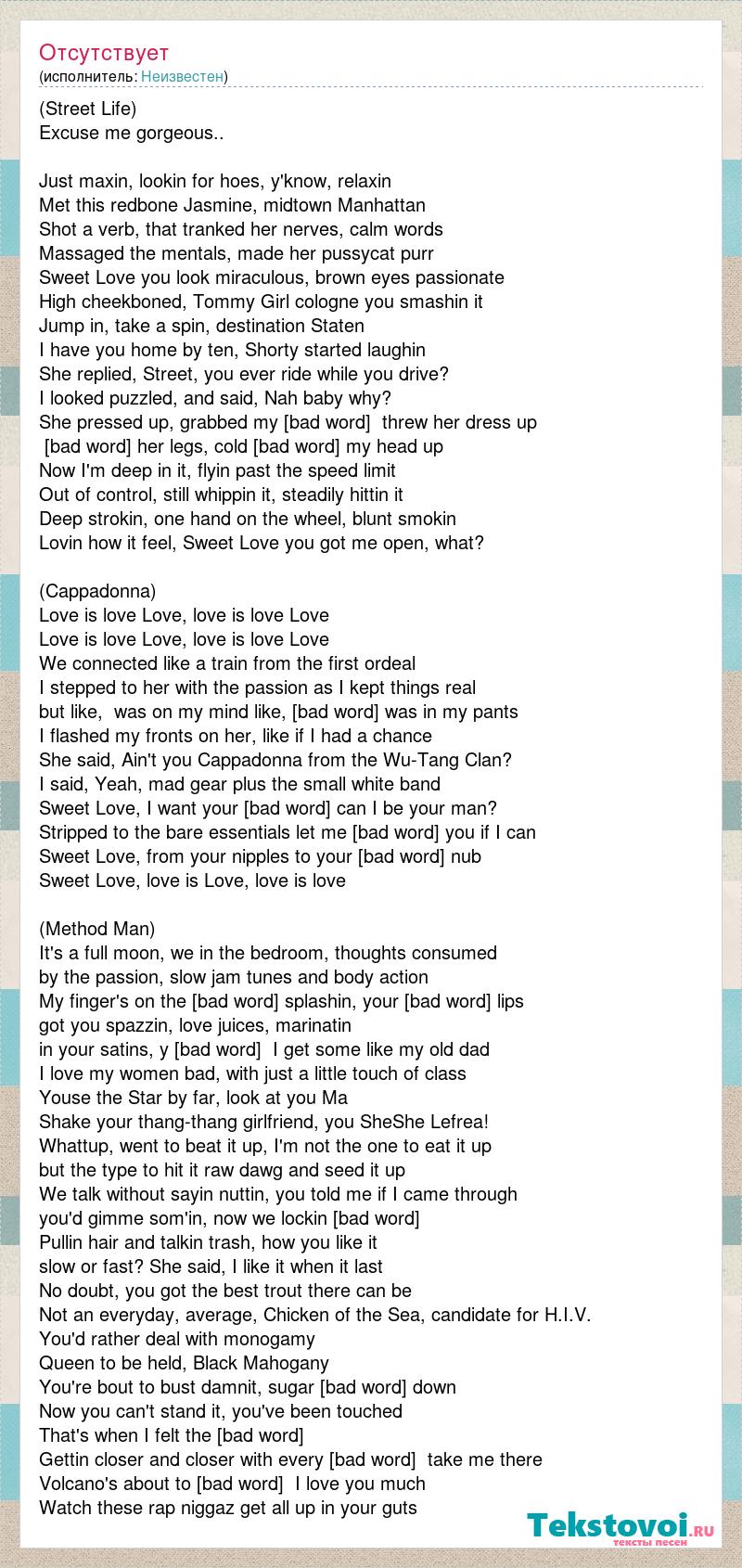 (Street Life) Excuse me gorgeous.. Just maxin, lookin for hoes, y'know, relaxin Met this redbone Jasmine, midtown Manhattan Shot a verb, that tranked her nerves, calm words Massaged the mentals, made her pussycat purr Sweet Love you look miraculous, brown eyes passionate High cheekboned, Tommy Girl cologne you smashin it Jump in, take a spin, destination Staten I have you home by ten, Shorty started laughin She replied, Street, you ever ride while you drive? I looked puzzled, and said, Nah baby why? She pressed up, grabbed my dick, threw her dress up Cocked her legs, cold fucked my head up Now I'm deep in it, flyin past the speed limit Out of control, still whippin it, steadily hittin it Deep strokin, one hand on the wheel, blunt smokin Lovin how it feel, Sweet Love you got me open, what? (Cappadonna) Love is love Love, love is love Love Love is love Love, love is love Love We connected like a train from the first ordeal I stepped to her with the passion as I kept things real but like, was on my mind like, cum was in my pants I flashed my fronts on her, like if I had a chance She said, Ain't you Cappadonna from the Wu-Tang Clan? I said, Yeah, mad gear plus the small white band Sweet Love, I want your pussy can I be your man? Stripped to the bare essentials let me fuck you if I can Sweet Love, from your nipples to your pussy nub Sweet Love, love is Love, love is love (Method Man) It's a full moon, we in the bedroom, thoughts consumed by the passion, slow jam tunes and body action My finger's on the clit splashin, your pussy lips got you spazzin, love juices, marinatin in your satins, y ass, I get some like my old dad I love my women bad, with just a little touch of class Youse the Star by far, look at you Ma Shake your thang-thang girlfriend, you SheShe Lefrea! Whattup, went to beat it up, I'm not the one to eat it up but the type to hit it raw dawg and seed it up We talk without sayin nuttin, you told me if I came through you'd gimme som'in, now we lockin ass Pullin hair and talkin trash, how you like it slow or fast? She said, I like it when it last No doubt, you got the best trout there can be Not an everyday, average, Chicken of the Sea, candidate for H.I.V. You'd rather deal with monogamy Queen to be held, Black Mahogany You're bout to bust damnit, sugar walls comin down Now you can't stand it, you've been touched That's when I felt the blood rush Gettin closer and closer with every thrust, take me there Volcano's about to erupt, I love you much Watch these rap niggaz get all up in your guts