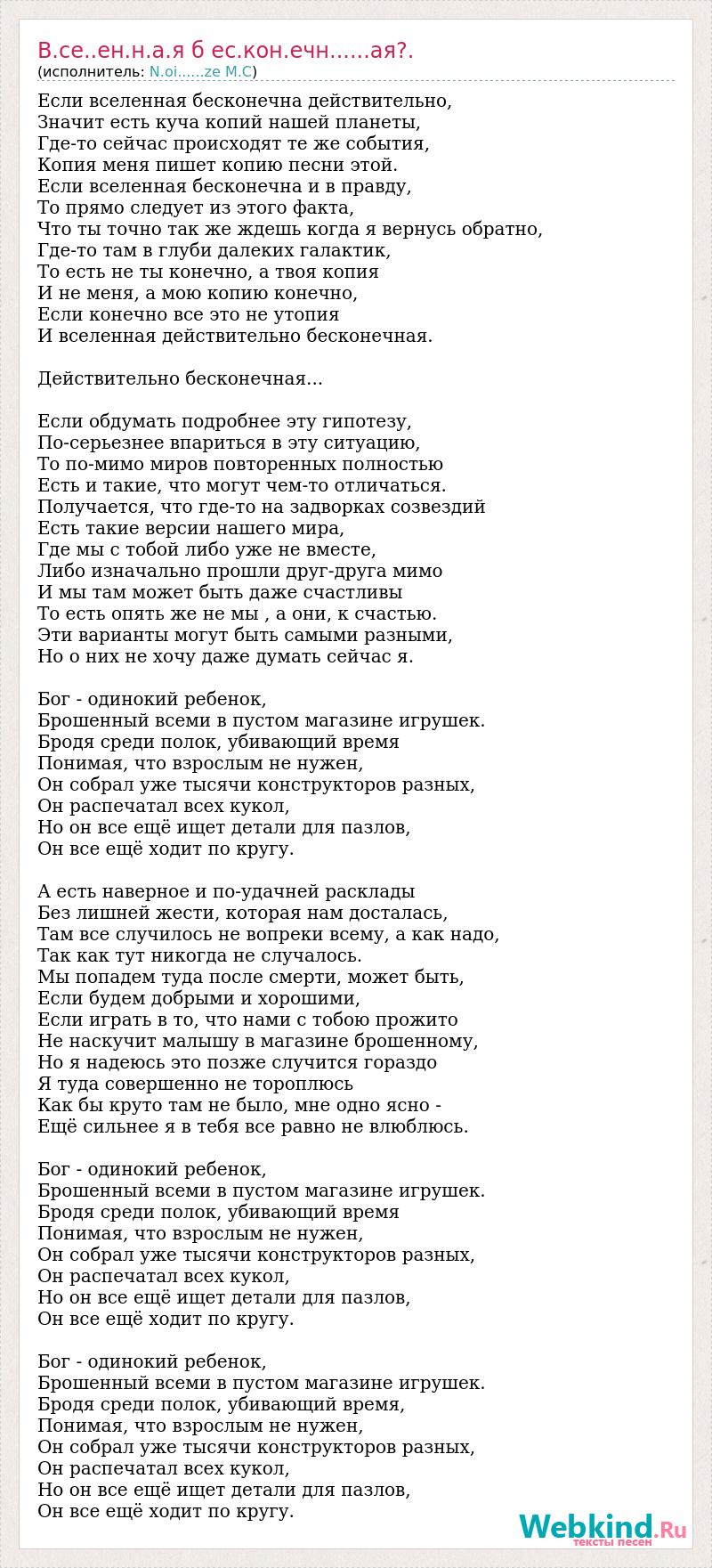 Если вселенная бесконечна действительно, Значит есть куча копий нашей планеты, Где-то сейчас происходят те же события, Копия меня пишет копию песни этой. Если вселенная бесконечна и в правду, То прямо следует из этого факта, Что ты точно так же ждешь когда я вернусь обратно, Где-то там в глуби далеких галактик, То есть не ты конечно, а твоя копия И не меня, а мою копию конечно, Если конечно все это не утопия И вселенная действительно бесконечная. Действительно бесконечная... Если обдумать подробнее эту гипотезу, По-серьезнее впариться в эту ситуацию, То по-мимо миров повторенных полностью Есть и такие, что могут чем-то отличаться. Получается, что где-то на задворках созвездий Есть такие версии нашего мира, Где мы с тобой либо уже не вместе, Либо изначально прошли друг-друга мимо И мы там может быть даже счастливы То есть опять же не мы , а они, к счастью. Эти варианты могут быть самыми разными, Но о них не хочу даже думать сейчас я. Бог - одинокий ребенок, Брошенный всеми в пустом магазине игрушек. Бродя среди полок, убивающий время Понимая, что взрослым не нужен, Он собрал уже тысячи конструкторов разных, Он распечатал всех кукол, Но он все ещё ищет детали для пазлов, Он все ещё ходит по кругу. А есть наверное и по-удачней расклады Без лишней жести, которая нам досталась, Там все случилось не вопреки всему, а как надо, Так как тут никогда не случалось. Мы попадем туда после смерти, может быть, Если будем добрыми и хорошими, Если играть в то, что нами с тобою прожито Не наскучит малышу в магазине брошенному, Но я надеюсь это позже случится гораздо Я туда совершенно не тороплюсь Как бы круто там не было, мне одно ясно - Ещё сильнее я в тебя все равно не влюблюсь. Бог - одинокий ребенок, Брошенный всеми в пустом магазине игрушек. Бродя среди полок, убивающий время Понимая, что взрослым не нужен, Он собрал уже тысячи конструкторов разных, Он распечатал всех кукол, Но он все ещё ищет детали для пазлов, Он все ещё ходит по кругу. Бог - одинокий ребенок, Брошенный всеми в пустом магазине игрушек. Бродя среди полок, убивающий время, Понимая, что взрослым не нужен, Он собрал уже тысячи конструкторов разных, Он распечатал всех кукол, Но он все ещё ищет детали для пазлов, Он все ещё ходит по кругу.