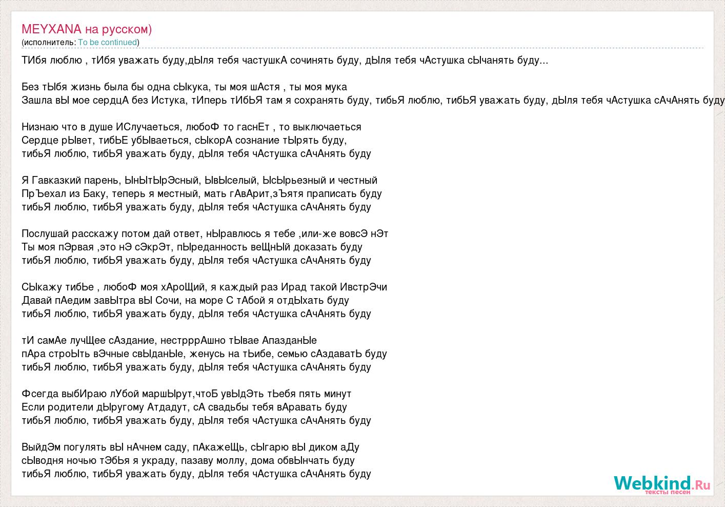 ТИбя люблю , тИбя уважать буду,дЫля тебя частушкА сочинять буду, дЫля тебя чАстушка сЫчанять буду... Без тЫбя жизнь была бы одна сЫкука, ты моя шАстя , ты моя мука Зашла вЫ мое сердцА без Истука, тИперь тИбЬЯ там я сохранять буду, тибьЯ люблю, тибЬЯ уважать буду, дЫля тебя чАстушка сАчАнять буду Низнаю что в душе ИСлучаеться, любоФ то гаснЕт , то выключаеться Сердце рЫвет, тибЬЕ убЫваеться, сЫкорА сознание тЫрять буду, тибьЯ люблю, тибЬЯ уважать буду, дЫля тебя чАстушка сАчАнять буду Я Гавказкий парень, ЫнЫтЫрЭсный, ЫвЫселый, ЫсЫрьезный и честный ПрЪехал из Баку, теперь я местный, мать гАвАрит,зЪятя праписать буду тибьЯ люблю, тибЬЯ уважать буду, дЫля тебя чАстушка сАчАнять буду Послушай расскажу потом дай ответ, нЫравлюсь я тебе ,или-же вовсЭ нЭт Ты моя пЭрвая ,это нЭ сЭкрЭт, пЫреданность веЩнЫй доказать буду тибьЯ люблю, тибЬЯ уважать буду, дЫля тебя чАстушка сАчАнять буду СЫкажу тибЬе , любоФ моя хАроЩий, я каждый раз Ирад такой ИвстрЭчи Давай пАедим завЫтра вЫ Сочи, на море С тАбой я отдЫхать буду тибьЯ люблю, тибЬЯ уважать буду, дЫля тебя чАстушка сАчАнять буду тИ самАе лучЩее сАздание, нестрррАшно тЫвае АпазданЫе пАра строЫть вЭчные свЫданЫе, женусь на тЬибе, семью сАздаватЬ буду тибьЯ люблю, тибЬЯ уважать буду, дЫля тебя чАстушка сАчАнять буду Фсегда выбИраю лУбой маршЫрут,чтоБ увЫдЭть тЬебя пять минут Если родители дЫругому Атдадут, сА свадьбы тебя вАравать буду тибьЯ люблю, тибЬЯ уважать буду, дЫля тебя чАстушка сАчАнять буду ВыйдЭм погулять вЫ нАчнем саду, пАкажеЩь, сЫгарю вЫ диком аДу сЫводня ночью тЭбЬя я украду, пазаву моллу, дома обвЫнчать буду тибьЯ люблю, тибЬЯ уважать буду, дЫля тебя чАстушка сАчАнять буду