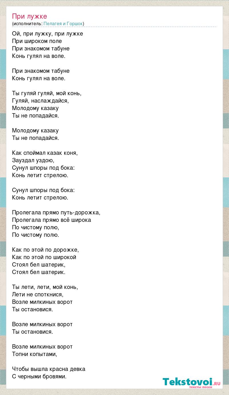 Ой, при лужку, при лужке При широком поле При знакомом табуне Конь гулял на воле. При знакомом табуне Конь гулял на воле. Ты гуляй гуляй, мой конь, Гуляй, наслаждайся, Молодому казаку Ты не попадайся. Молодому казаку Ты не попадайся. Как споймал казак коня, Зауздал уздою, Сунул шпоры под бока: Конь летит стрелою. Сунул шпоры под бока: Конь летит стрелою. Пролегала прямо путь-дорожка, Пролегала прямо всё широка По чистому полю, По чистому полю. Как по этой по дорожке, Как по этой по широкой Стоял бел шатерик, Стоял бел шатерик. Ты лети, лети, мой конь, Лети не споткнися, Возле милкиных ворот Ты остановися. Возле милкиных ворот Ты остановися. Возле милкиных ворот Топни копытами, Чтобы вышла красна девка С черными бровями.
