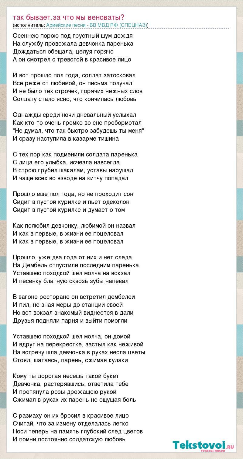 Осеннею порою под грустный шум дождя На службу провожала девчонка паренька Дождаться обещала, целуя горячо А он смотрел с тревогой в красивое лицо И вот прошло пол года, солдат затосковал Все реже от любимой, он письма получал И не было тех строчек, горячих нежных слов Солдату стало ясно, что кончилась любовь Однажды среди ночи дневальный услыхал Как кто-то очень громко во сне пробормотал "Не думал, что так быстро забудешь ты меня" И сразу наступила в казарме тишина С тех пор как подменили солдата паренька С лица его улыбка, исчезла навсегда В строю грубил шакалам, уставы нарушал И чаще всех во взводе на китчу попадал Прошло еще пол года, но не проходит сон Сидит в пустой курилке и пьет одеколон Сидит в пустой курилке и думает о том Как полюбил девчонку, любимой он назвал И как в первые, в жизни ее поцеловал И как в первые, в жизни ее поцеловал Прошло, уже два года от них и нет следа На Дембель отпустили последним паренька Уставшею походкой шел молча на вокзал И песенку блатную сквозь зубы напевал В вагоне ресторане он встретил дембелей И пил, не зная меры до станции своей Но вот вокзал знакомый виднеется в дали Друзья подняли парня и выйти помогли Уставшею походкой шел молча, он домой И вдруг на перекрестке, застыл как неживой На встречу шла девчонка в руках несла цветы Стоял, шатаясь, парень, сжимая кулаки Кому ты дорогая несешь такой букет Девчонка, растерявшись, ответила тебе И протянула розы дрожащею рукой Сжимал в руках их парень не ощущая боль С размаху он их бросил в красивое лицо Считай, что за измену отделалась легко Носи теперь на память глубокий след цветов И помни постоянно солдатскую любовь