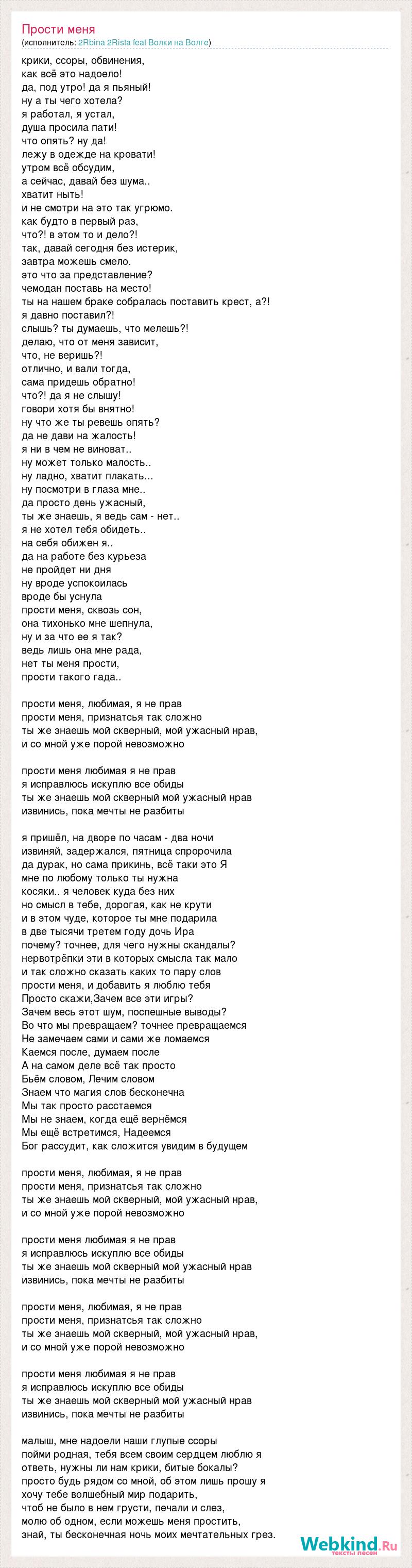 крики, ссоры, обвинения, как всё это надоело! да, под утро! да я пьяный! ну а ты чего хотела? я работал, я устал, душа просила пати! что опять? ну да! лежу в одежде на кровати! утром всё обсудим, а сейчас, давай без шума.. хватит ныть! и не смотри на это так угрюмо. как будто в первый раз, что?! в этом то и дело?! так, давай сегодня без истерик, завтра можешь смело. это что за представление? чемодан поставь на место! ты на нашем браке собралась поставить крест, а?! я давно поставил?! слышь? ты думаешь, что мелешь?! делаю, что от меня зависит, что, не веришь?! отлично, и вали тогда, сама придешь обратно! что?! да я не слышу! говори хотя бы внятно! ну что же ты ревешь опять? да не дави на жалость! я ни в чем не виноват.. ну может только малость.. ну ладно, хватит плакать... ну посмотри в глаза мне.. да просто день ужасный, ты же знаешь, я ведь сам - нет.. я не хотел тебя обидеть.. на себя обижен я.. да на работе без курьеза не пройдет ни дня ну вроде успокоилась вроде бы уснула прости меня, сквозь сон, она тихонько мне шепнула, ну и за что ее я так? ведь лишь она мне рада, нет ты меня прости, прости такого гада.. прости меня, любимая, я не прав прости меня, признатсья так сложно ты же знаешь мой скверный, мой ужасный нрав, и со мной уже порой невозможно прости меня любимая я не прав я исправлюсь искуплю все обиды ты же знаешь мой скверный мой ужасный нрав извинись, пока мечты не разбиты я пришёл, на дворе по часам - два ночи извиняй, задержался, пятница спророчила да дурак, но сама прикинь, всё таки это Я мне по любому только ты нужна косяки.. я человек куда без них но смысл в тебе, дорогая, как не крути и в этом чуде, которое ты мне подарила в две тысячи третем году дочь Ира почему? точнее, для чего нужны скандалы? нервотрёпки эти в которых смысла так мало и так сложно сказать каких то пару слов прости меня, и добавить я люблю тебя Просто скажи,Зачем все эти игры? Зачем весь этот шум, поспешные выводы? Во что мы превращаем? точнее превращаемся Не замечаем сами и сами же ломаемся Каемся после, думаем после А на самом деле всё так просто Бьём словом, Лечим словом Знаем что магия слов бесконечна Мы так просто расстаемся Мы не знаем, когда ещё вернёмся Мы ещё встретимся, Надеемся Бог рассудит, как сложится увидим в будущем прости меня, любимая, я не прав прости меня, признатсья так сложно ты же знаешь мой скверный, мой ужасный нрав, и со мной уже порой невозможно прости меня любимая я не прав я исправлюсь искуплю все обиды ты же знаешь мой скверный мой ужасный нрав извинись, пока мечты не разбиты прости меня, любимая, я не прав прости меня, признатсья так сложно ты же знаешь мой скверный, мой ужасный нрав, и со мной уже порой невозможно прости меня любимая я не прав я исправлюсь искуплю все обиды ты же знаешь мой скверный мой ужасный нрав извинись, пока мечты не разбиты малыш, мне надоели наши глупые ссоры пойми родная, тебя всем своим сердцем люблю я ответь, нужны ли нам крики, битые бокалы? просто будь рядом со мной, об этом лишь прошу я хочу тебе волшебный мир подарить, чтоб не было в нем грусти, печали и слез, молю об одном, если можешь меня простить, знай, ты бесконечная ночь моих мечтательных грез.