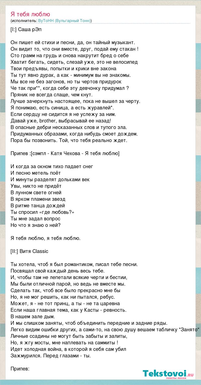 [I:] Саша рЭп Он пишет ей стихи и песни, да, он тайный музыкант. Он видит то, что они вместе, друг, подай ему стакан ! Сто грамм на грудь и снова накрутит бред о себе Хватит бегать, сидеть, слезай уже, это не велосипед Твои предъявы, попытки и крики вне закона Ты тут явно дурак, а как - минимум вы не знакомы. Мы все не без загонов, но ты чертов придурок Че так при**, когда себе эту девчонку придумал ? Пряник не всегда слаще, чем кнут. Лучше зачеркнуть настоящее, пока не вышел за черту. Я понимаю, есть синица, а есть журавлей*. Если сердцу не сидится я не услежу за ним. Давай уже, brother, выбрасывай ее назад! В опасные дебри несказанных слов и тупого зла. Придуманных образами, когда нибудь смоет дождем. Пора бы позвонить. Той, что тебя реально ждет. Припев :[сэмпл - Катя Чехова - Я тебя люблю] И когда за окном тихо падает снег И песню метель поёт И минуты разделят дольками век Увы, никто не придёт В лунном свете огней В ярком пламени звезд В ритме танца дождей Ты спросил «где любовь?» Ты мне задал вопрос Но что я знаю о ней? Я тебя люблю, я тебя люблю. [II:] Витя Classic Ты хотела, чтоб я был романтиком, писал тебе песни. Посвящал свой каждый день весь тебе. И, чтобы там не лепетали всякие черти и бестии, Мы были отличной парой, но ведь не вместе мы. Сделать так, чтоб все было прекрасно мне бы Но, я не мог решить, как ни пытался, ребус. Может, я - не тот принц, а ты - не та царевна Если наша главная тема, как у Касты - ревность. В нашем зале дым. И мы слишком заняты, чтоб объединить передние и задние ряды. Легко видим ошибки других, а сами-то, на свою душу вешаем табличку "Занято" Личные ссадины не могут быть забыты и залиты, Но, я жгу мосты, мне наплевать на саммиты ! Идет холодная война, в которой я себя сам убил Зажмурился. Перед глазами - ты. Припев: