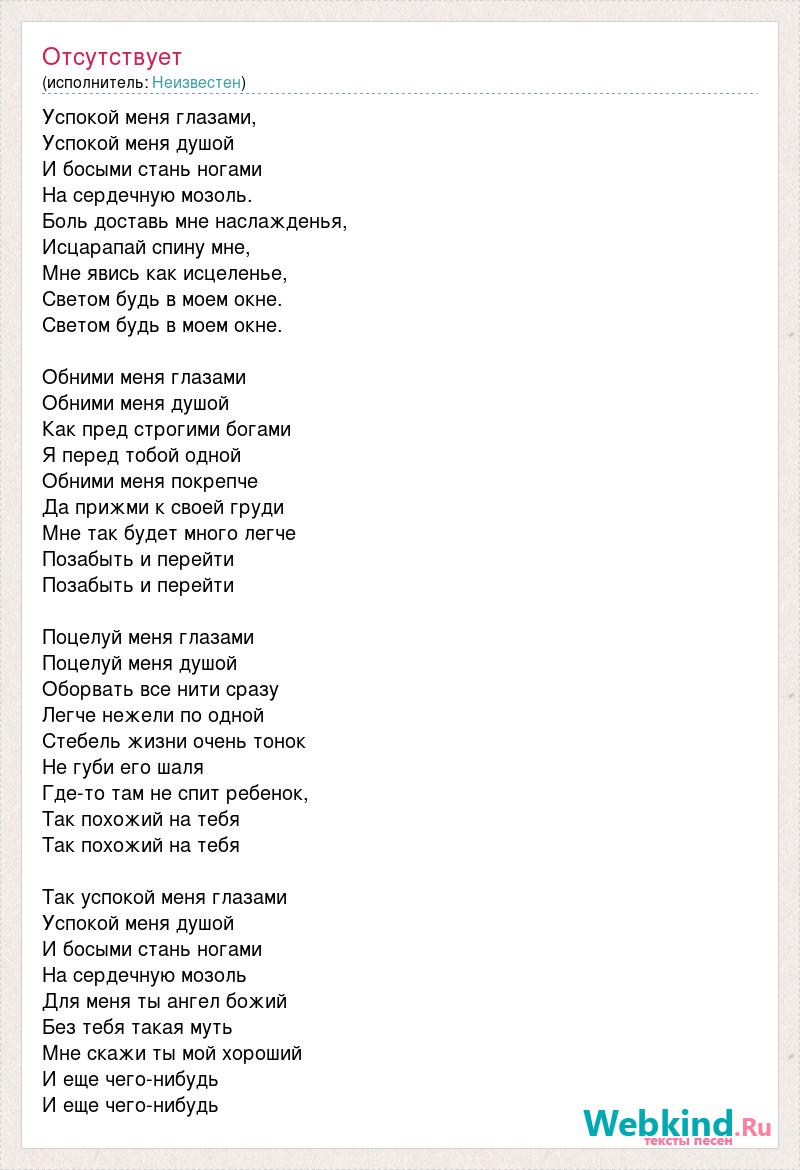 Успокой меня глазами, Успокой меня душой И босыми стань ногами На сердечную мозоль. Боль доставь мне наслажденья, Исцарапай спину мне, Мне явись как исцеленье, Светом будь в моем окне. Светом будь в моем окне. Обними меня глазами Обними меня душой Как пред строгими богами Я перед тобой одной Обними меня покрепче Да прижми к своей груди Мне так будет много легче Позабыть и перейти Позабыть и перейти Поцелуй меня глазами Поцелуй меня душой Оборвать все нити сразу Легче нежели по одной Стебель жизни очень тонок Не губи его шаля Где-то там не спит ребенок, Так похожий на тебя Так похожий на тебя Так успокой меня глазами Успокой меня душой И босыми стань ногами На сердечную мозоль Для меня ты ангел божий Без тебя такая муть Мне скажи ты мой хороший И еще чего-нибудь И еще чего-нибудь