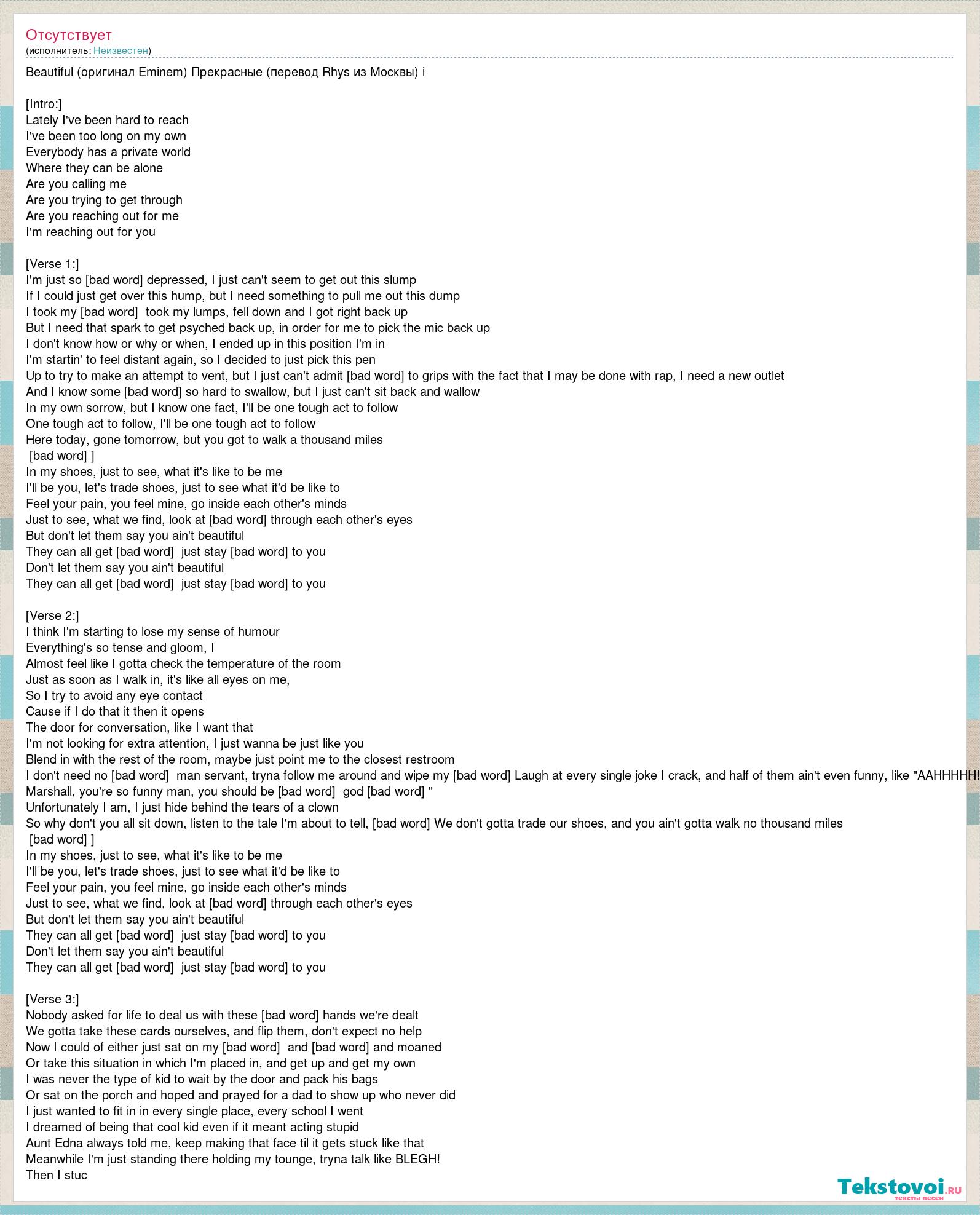 Beautiful (оригинал Eminem) Прекрасные (перевод Rhys из Москвы) i [Intro:] Lately I've been hard to reach I've been too long on my own Everybody has a private world Where they can be alone Are you calling me Are you trying to get through Are you reaching out for me I'm reaching out for you [Verse 1:] I'm just so [bad word] depressed, I just can't seem to get out this slump If I could just get over this hump, but I need something to pull me out this dump I took my bruises, took my lumps, fell down and I got right back up But I need that spark to get psyched back up, in order for me to pick the mic back up I don't know how or why or when, I ended up in this position I'm in I'm startin' to feel distant again, so I decided to just pick this pen Up to try to make an attempt to vent, but I just can't admit Or come to grips with the fact that I may be done with rap, I need a new outlet And I know some [bad word] so hard to swallow, but I just can't sit back and wallow In my own sorrow, but I know one fact, I'll be one tough act to follow One tough act to follow, I'll be one tough act to follow Here today, gone tomorrow, but you got to walk a thousand miles [Chorus:] In my shoes, just to see, what it's like to be me I'll be you, let's trade shoes, just to see what it'd be like to Feel your pain, you feel mine, go inside each other's minds Just to see, what we find, look at [bad word] through each other's eyes But don't let them say you ain't beautiful They can all get [bad word] just stay true to you Don't let them say you ain't beautiful They can all get [bad word] just stay true to you [Verse 2:] I think I'm starting to lose my sense of humour Everything's so tense and gloom, I Almost feel like I gotta check the temperature of the room Just as soon as I walk in, it's like all eyes on me, So I try to avoid any eye contact Cause if I do that it then it opens The door for conversation, like I want that I'm not looking for extra attention, I just wanna be just like you Blend in with the rest of the room, maybe just point me to the closest restroom I don't need no [bad word] man servant, tryna follow me around and wipe my [bad word] Laugh at every single joke I crack, and half of them ain't even funny, like "AAHHHHH! Marshall, you're so funny man, you should be a comedian, god [bad word] " Unfortunately I am, I just hide behind the tears of a clown So why don't you all sit down, listen to the tale I'm about to tell, hell We don't gotta trade our shoes, and you ain't gotta walk no thousand miles [Chorus:] In my shoes, just to see, what it's like to be me I'll be you, let's trade shoes, just to see what it'd be like to Feel your pain, you feel mine, go inside each other's minds Just to see, what we find, look at [bad word] through each other's eyes But don't let them say you ain't beautiful They can all get [bad word] just stay true to you Don't let them say you ain't beautiful They can all get [bad word] just stay true to you [Verse 3:] Nobody asked for life to deal us with these [bad word] hands we're dealt We gotta take these cards ourselves, and flip them, don't expect no help Now I could of either just sat on my [bad word] and [bad word] and moaned Or take this situation in which I'm placed in, and get up and get my own I was never the type of kid to wait by the door and pack his bags Or sat on the porch and hoped and prayed for a dad to show up who never did I just wanted to fit in in every single place, every school I went I dreamed of being that cool kid even if it meant acting stupid Aunt Edna always told me, keep making that face til it gets stuck like that Meanwhile I'm just standing there holding my tounge, tryna talk like BLEGH! Then I stuc