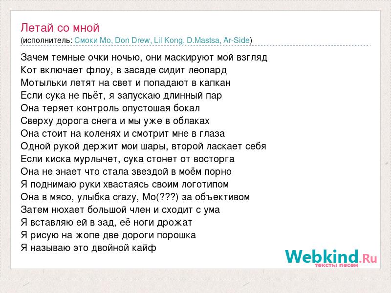 Зачем темные очки ночью, они маскируют мой взгляд Кот включает флоу, в засаде сидит леопард Мотыльки летят на свет и попадают в капкан Если сука не пьёт, я запускаю длинный пар Она теряет контроль опустошая бокал Сверху дорога снега и мы уже в облаках Она стоит на коленях и смотрит мне в глаза Одной рукой держит мои шары, второй ласкает себя Если киска мурлычет, сука стонет от восторга Она не знает что стала звездой в моём порно Я поднимаю руки хвастаясь своим логотипом Она в мясо, улыбка crazy, Мо(???) за объективом Затем нюхает большой член и сходит с ума Я вставляю ей в зад, её ноги дрожат Я рисую на жопе две дороги порошка Я называю это двойной кайф