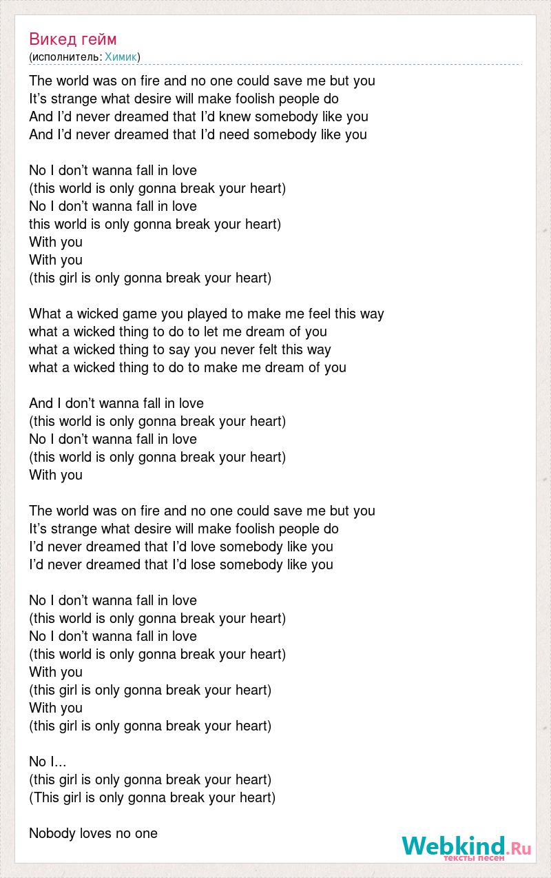 The world was on fire and no one could save me but you It’s strange what desire will make foolish people do And I’d never dreamed that I’d knew somebody like you And I’d never dreamed that I’d need somebody like you No I don’t wanna fall in love (this world is only gonna break your heart) No I don’t wanna fall in love this world is only gonna break your heart) With you With you (this girl is only gonna break your heart) What a wicked game you played to make me feel this way what a wicked thing to do to let me dream of you what a wicked thing to say you never felt this way what a wicked thing to do to make me dream of you And I don’t wanna fall in love (this world is only gonna break your heart) No I don’t wanna fall in love (this world is only gonna break your heart) With you The world was on fire and no one could save me but you It’s strange what desire will make foolish people do I’d never dreamed that I’d love somebody like you I’d never dreamed that I’d lose somebody like you No I don’t wanna fall in love (this world is only gonna break your heart) No I don’t wanna fall in love (this world is only gonna break your heart) With you (this girl is only gonna break your heart) With you (this girl is only gonna break your heart) No I... (this girl is only gonna break your heart) (This girl is only gonna break your heart) Nobody loves no one