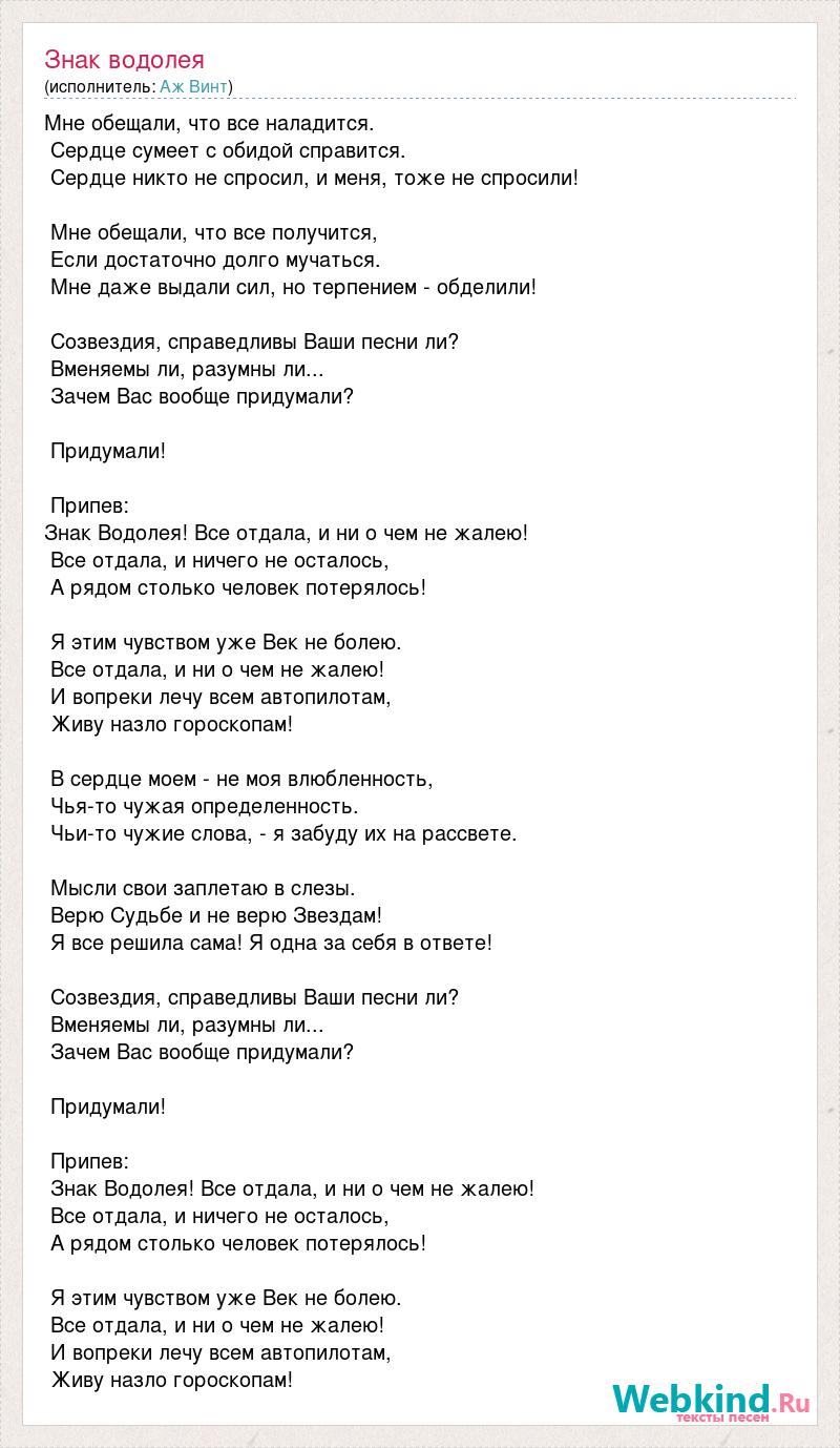 Мне обещали, что все наладится. Сердце сумеет с обидой справится. Сердце никто не спросил, и меня, тоже не спросили! Мне обещали, что все получится, Если достаточно долго мучаться. Мне даже выдали сил, но терпением - обделили! Созвездия, справедливы Ваши песни ли? Вменяемы ли, разумны ли... Зачем Вас вообще придумали? Придумали! Припев: Знак Водолея! Все отдала, и ни о чем не жалею! Все отдала, и ничего не осталось, А рядом столько человек потерялось! Я этим чувством уже Век не болею. Все отдала, и ни о чем не жалею! И вопреки лечу всем автопилотам, Живу назло гороскопам! В сердце моем - не моя влюбленность, Чья-то чужая определенность. Чьи-то чужие слова, - я забуду их на рассвете. Мысли свои заплетаю в слезы. Верю Судьбе и не верю Звездам! Я все решила сама! Я одна за себя в ответе! Созвездия, справедливы Ваши песни ли? Вменяемы ли, разумны ли... Зачем Вас вообще придумали? Придумали! Припев: Знак Водолея! Все отдала, и ни о чем не жалею! Все отдала, и ничего не осталось, А рядом столько человек потерялось! Я этим чувством уже Век не болею. Все отдала, и ни о чем не жалею! И вопреки лечу всем автопилотам, Живу назло гороскопам!