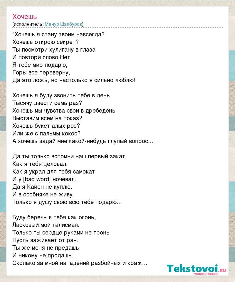 "Хочешь я стану твоим навсегда? Хочешь открою секрет? Ты посмотри хулигану в глаза И повтори слово Нет. Я тебе мир подарю, Горы все переверну, Да это ложь, но настолько я сильно люблю! Хочешь я буду звонить тебе в день Тысячу двести семь раз? Хочешь мы чувства свои в дребедень Выставим всем на показ? Хочешь букет алых роз? Или же с пальмы кокос? А хочешь задай мне какой-нибудь глупый вопрос... Да ты только вспомни наш первый закат, Как я тебя целовал. Как я украл для тебя самокат И у [bad word] ночевал. Да я Кайен не куплю, И в особняке не живу. Только я душу свою всю тебе подарю... Буду беречь я тебя как огонь, Ласковый мой талисман. Только ты сердце руками не тронь Пусть заживает от ран. Ты же меня не предашь И никому не продашь. Сколько за мной нападений разбойных и краж...