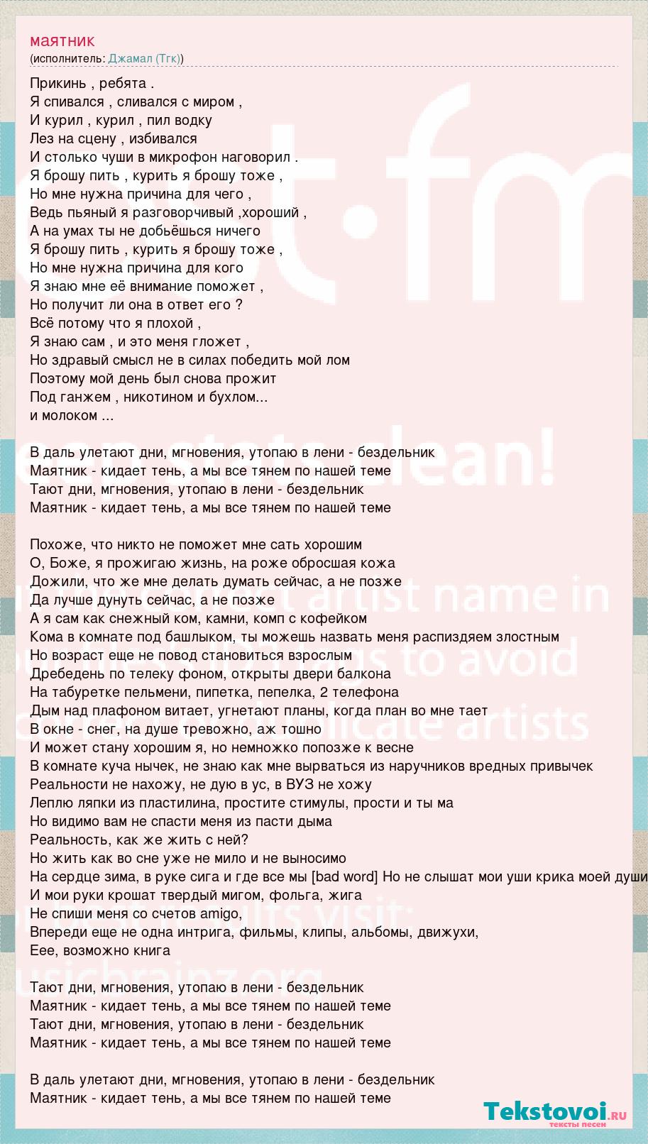 Прикинь , ребята . Я спивался , сливался с миром , И курил , курил , пил водку Лез на сцену , избивался И столько чуши в микрофон наговорил . Я брошу пить , курить я брошу тоже , Но мне нужна причина для чего , Ведь пьяный я разговорчивый ,хороший , А на умах ты не добьёшься ничего Я брошу пить , курить я брошу тоже , Но мне нужна причина для кого Я знаю мне её внимание поможет , Но получит ли она в ответ его ? Всё потому что я плохой , Я знаю сам , и это меня гложет , Но здравый смысл не в силах победить мой лом Поэтому мой день был снова прожит Под ганжем , никотином и бухлом... и молоком ... В даль улетают дни, мгновения, утопаю в лени - бездельник Маятник - кидает тень, а мы все тянем по нашей теме Тают дни, мгновения, утопаю в лени - бездельник Маятник - кидает тень, а мы все тянем по нашей теме Похоже, что никто не поможет мне сать хорошим О, Боже, я прожигаю жизнь, на роже обросшая кожа Дожили, что же мне делать думать сейчас, а не позже Да лучше дунуть сейчас, а не позже А я сам как снежный ком, камни, комп с кофейком Кома в комнате под башлыком, ты можешь назвать меня распиздяем злостным Но возраст еще не повод становиться взрослым Дребедень по телеку фоном, открыты двери балкона На табуретке пельмени, пипетка, пепелка, 2 телефона Дым над плафоном витает, угнетают планы, когда план во мне тает В окне - снег, на душе тревожно, аж тошно И может стану хорошим я, но немножко попозже к весне В комнате куча нычек, не знаю как мне вырваться из наручников вредных привычек Реальности не нахожу, не дую в ус, в ВУЗ не хожу Леплю ляпки из пластилина, простите стимулы, прости и ты ма Но видимо вам не спасти меня из пасти дыма Реальность, как же жить с ней? Но жить как во сне уже не мило и не выносимо На сердце зима, в руке сига и где все мы [bad word] Но не слышат мои уши крика моей души И мои руки крошат твердый мигом, фольга, жига Не спиши меня со счетов amigo, Впереди еще не одна интрига, фильмы, клипы, альбомы, движухи, Еее, возможно книга Тают дни, мгновения, утопаю в лени - бездельник Маятник - кидает тень, а мы все тянем по нашей теме Тают дни, мгновения, утопаю в лени - бездельник Маятник - кидает тень, а мы все тянем по нашей теме В даль улетают дни, мгновения, утопаю в лени - бездельник Маятник - кидает тень, а мы все тянем по нашей теме
