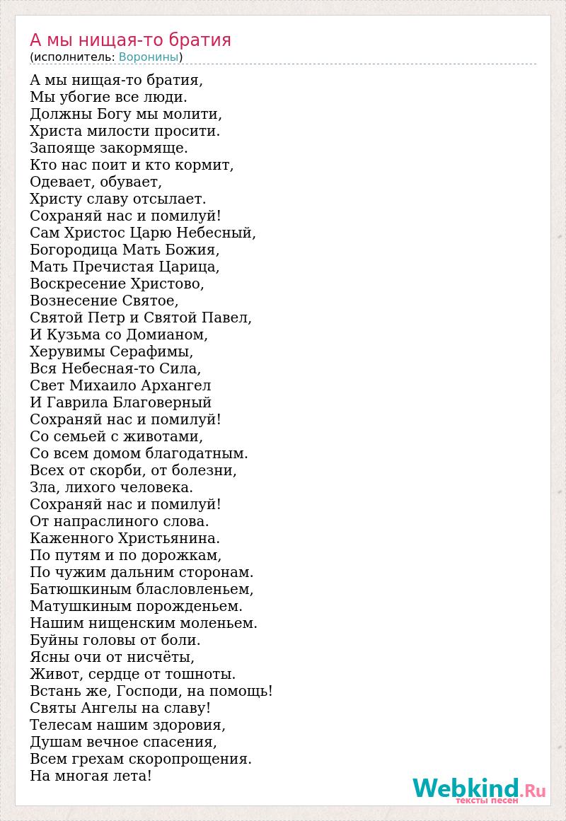 А мы нищая-то братия, Мы убогие все люди. Должны Богу мы молити, Христа милости просити. Запояще закормяще. Кто нас поит и кто кормит, Одевает, обувает, Христу славу отсылает. Сохраняй нас и помилуй! Сам Христос Царю Небесный, Богородица Мать Божия, Мать Пречистая Царица, Воскресение Христово, Вознесение Святое, Святой Петр и Святой Павел, И Кузьма со Домианом, Херувимы Серафимы, Вся Небесная-то Сила, Свет Михаило Архангел И Гаврила Благоверный Сохраняй нас и помилуй! Со семьей с животами, Со всем домом благодатным. Всех от скорби, от болезни, Зла, лихого человека. Сохраняй нас и помилуй! От напраслиного слова. Каженного Христьянина. По путям и по дорожкам, По чужим дальним сторонам. Батюшкиным бласловленьем, Матушкиным порожденьем. Нашим нищенским моленьем. Буйны головы от боли. Ясны очи от нисчёты, Живот, сердце от тошноты. Встань же, Господи, на помощь! Святы Ангелы на славу! Телесам нашим здоровия, Душам вечное спасения, Всем грехам скоропрощения. На многая лета!