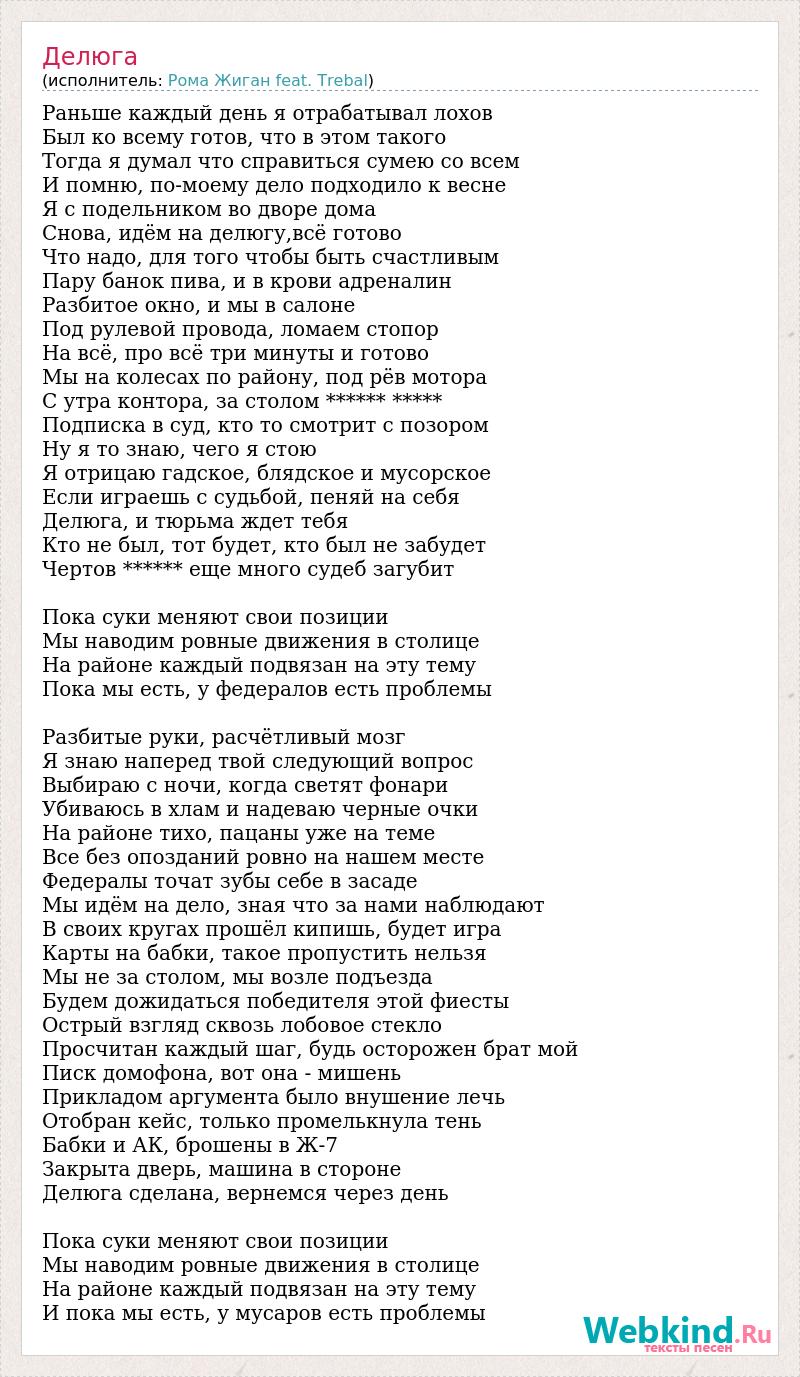 Раньше каждый день я отрабатывал лохов Был ко всему готов, что в этом такого Тогда я думал что справиться сумею со всем И помню, по-моему дело подходило к весне Я с подельником во дворе дома Снова, идём на делюгу,всё готово Что надо, для того чтобы быть счастливым Пару банок пива, и в крови адреналин Разбитое окно, и мы в салоне Под рулевой провода, ломаем стопор На всё, про всё три минуты и готово Мы на колесах по району, под рёв мотора С утра контора, за столом ****** ***** Подписка в суд, кто то смотрит с позором Ну я то знаю, чего я стою Я отрицаю гадское, блядское и мусорское Если играешь с судьбой, пеняй на себя Делюга, и тюрьма ждет тебя Кто не был, тот будет, кто был не забудет Чертов ****** еще много судеб загубит Пока суки меняют свои позиции Мы наводим ровные движения в столице На районе каждый подвязан на эту тему Пока мы есть, у федералов есть проблемы Разбитые руки, расчётливый мозг Я знаю наперед твой следующий вопрос Выбираю с ночи, когда светят фонари Убиваюсь в хлам и надеваю черные очки На районе тихо, пацаны уже на теме Все без опозданий ровно на нашем месте Федералы точат зубы себе в засаде Мы идём на дело, зная что за нами наблюдают В своих кругах прошёл кипишь, будет игра Карты на бабки, такое пропустить нельзя Мы не за столом, мы возле подъезда Будем дожидаться победителя этой фиесты Острый взгляд сквозь лобовое стекло Просчитан каждый шаг, будь осторожен брат мой Писк домофона, вот она - мишень Прикладом аргумента было внушение лечь Отобран кейс, только промелькнула тень Бабки и АК, брошены в Ж-7 Закрыта дверь, машина в стороне Делюга сделана, вернемся через день Пока суки меняют свои позиции Мы наводим ровные движения в столице На районе каждый подвязан на эту тему И пока мы есть, у мусаров есть проблемы