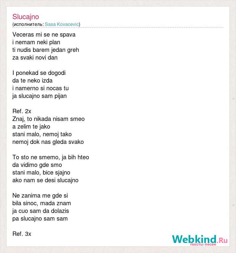 Veceras mi se ne spava i nemam neki plan ti nudis barem jedan greh za svaki novi dan I ponekad se dogodi da te neko izda i namerno si nocas tu ja slucajno sam pijan Ref. 2x Znaj, to nikada nisam smeo a zelim te jako stani malo, nemoj tako nemoj dok nas gleda svako To sto ne smemo, ja bih hteo da vidimo gde smo stani malo, bice sjajno ako nam se desi slucajno Ne zanima me gde si bila sinoc, mada znam ja cuo sam da dolazis pa slucajno sam sam Ref. 3x