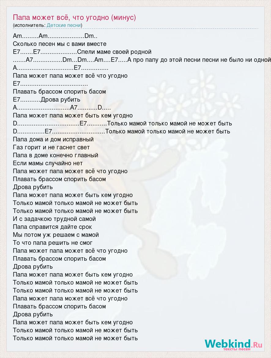 Am.........Am....................Dm.. Сколько песен мы с вами вместе E7.......E7....................Спели маме своей родной .......A7................Dm...Dm....Am....E7.....А про папу до этой песни песни не было ни одной A...............................E7............... Папа может папа может всё что угодно E7..................................... Плавать брассом спорить басом E7...........Дрова рубить A.............................A7...........D..... Папа может папа может быть кем угодно D..................................E7...........Только мамой только мамой не может быть D...............E7.............................Только мамой только мамой не может быть Папа дома и дом исправный Газ горит и не гаснет свет Папа в доме конечно главный Если мамы случайно нет Папа может папа может всё что угодно Плавать браcсом спорить басом Дрова рубить Папа может папа может быть кем угодно Только мамой только мамой не может быть Только мамой только мамой не может быть И с задачкою трудной самой Папа справится дайте срок Мы потом уж решаем с мамой То что папа решить не смог Папа может папа может всё что угодно Плавать браcсом спорить басом Дрова рубить Папа может папа может быть кем угодно Только мамой только мамой не может быть Только мамой только мамой не может быть Папа может папа может всё что угодно Плавать браcсом спорить басом Дрова рубить Папа может папа может быть кем угодно Только мамой только мамой не может быть Только мамой только мамой не может быть