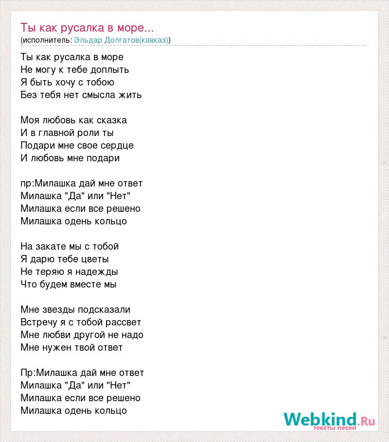 Ты как русалка в море Не могу к тебе доплыть Я быть хочу с тобою Без тебя нет смысла жить Моя любовь как сказка И в главной роли ты Подари мне свое сердце И любовь мне подари пр:Милашка дай мне ответ Милашка "Да" или "Нет" Милашка если все решено Милашка одень кольцо На закате мы с тобой Я дарю тебе цветы Не теряю я надежды Что будем вместе мы Мне звезды подсказали Встречу я с тобой рассвет Мне любви другой не надо Мне нужен твой ответ Пр:Милашка дай мне ответ Милашка "Да" или "Нет" Милашка если все решено Милашка одень кольцо