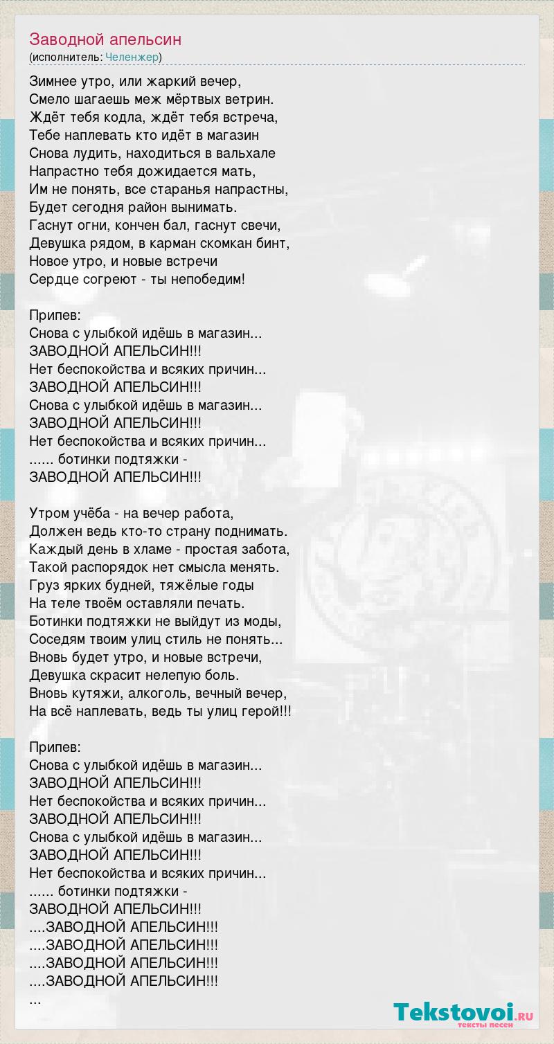 Зимнее утро, или жаркий вечер, Смело шагаешь меж мёртвых ветрин. Ждёт тебя кодла, ждёт тебя встреча, Тебе наплевать кто идёт в магазин Снова лудить, находиться в вальхале Напрастно тебя дожидается мать, Им не понять, все старанья напрастны, Будет сегодня район вынимать. Гаснут огни, кончен бал, гаснут свечи, Девушка рядом, в карман скомкан бинт, Новое утро, и новые встречи Сердце согреют - ты непобедим! Припев: Снова с улыбкой идёшь в магазин... ЗАВОДНОЙ АПЕЛЬСИН!!! Нет беспокойства и всяких причин... ЗАВОДНОЙ АПЕЛЬСИН!!! Снова с улыбкой идёшь в магазин... ЗАВОДНОЙ АПЕЛЬСИН!!! Нет беспокойства и всяких причин... ...... ботинки подтяжки - ЗАВОДНОЙ АПЕЛЬСИН!!! Утром учёба - на вечер работа, Должен ведь кто-то страну поднимать. Каждый день в хламе - простая забота, Такой распорядок нет смысла менять. Груз ярких будней, тяжёлые годы На теле твоём оставляли печать. Ботинки подтяжки не выйдут из моды, Соседям твоим улиц стиль не понять... Вновь будет утро, и новые встречи, Девушка скрасит нелепую боль. Вновь кутяжи, алкоголь, вечный вечер, На всё наплевать, ведь ты улиц герой!!! Припев: Снова с улыбкой идёшь в магазин... ЗАВОДНОЙ АПЕЛЬСИН!!! Нет беспокойства и всяких причин... ЗАВОДНОЙ АПЕЛЬСИН!!! Снова с улыбкой идёшь в магазин... ЗАВОДНОЙ АПЕЛЬСИН!!! Нет беспокойства и всяких причин... ...... ботинки подтяжки - ЗАВОДНОЙ АПЕЛЬСИН!!! ....ЗАВОДНОЙ АПЕЛЬСИН!!! ....ЗАВОДНОЙ АПЕЛЬСИН!!! ....ЗАВОДНОЙ АПЕЛЬСИН!!! ....ЗАВОДНОЙ АПЕЛЬСИН!!! ...