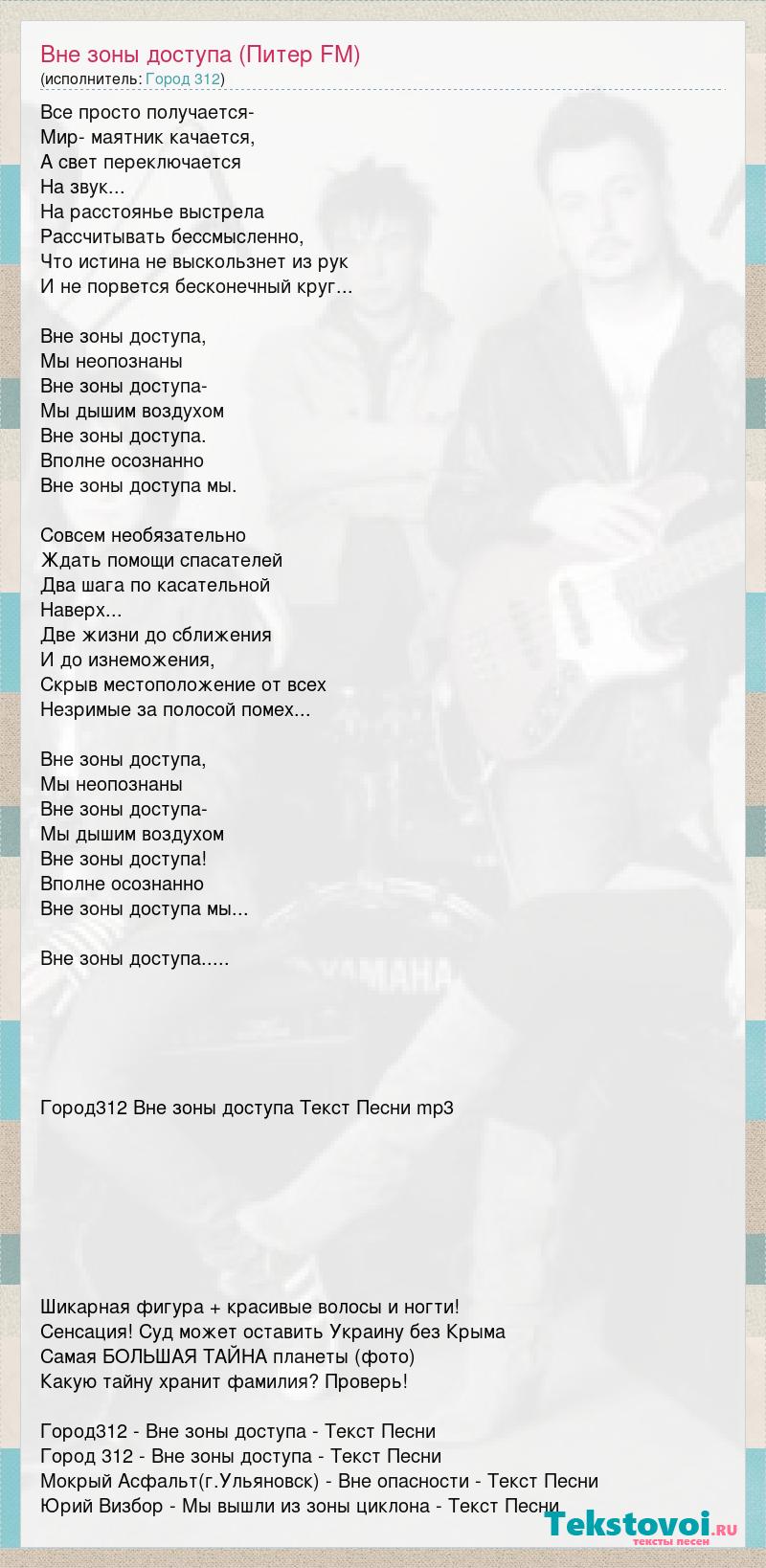 Все просто получается- Мир- маятник качается, А свет переключается На звук... На расстоянье выстрела Рассчитывать бессмысленно, Что истина не выскользнет из рук И не порвется бесконечный круг... Вне зоны доступа, Мы неопознаны Вне зоны доступа- Мы дышим воздухом Вне зоны доступа. Вполне осознанно Вне зоны доступа мы. Совсем необязательно Ждать помощи спасателей Два шага по касательной Наверх... Две жизни до сближения И до изнеможения, Скрыв местоположение от всех Незримые за полосой помех... Вне зоны доступа, Мы неопознаны Вне зоны доступа- Мы дышим воздухом Вне зоны доступа! Вполне осознанно Вне зоны доступа мы... Вне зоны доступа..... Город312 Вне зоны доступа Текст Песни mp3 Шикарная фигура + красивые волосы и ногти! Сенсация! Суд может оставить Украину без Крыма Самая БОЛЬШАЯ ТАЙНА планеты (фото) Какую тайну хранит фамилия? Проверь! Город312 - Вне зоны доступа - Текст Песни Город 312 - Вне зоны доступа - Текст Песни Мокрый Асфальт(г.Ульяновск) - Вне опасности - Текст Песни Юрий Визбор - Мы вышли из зоны циклона - Текст Песни
