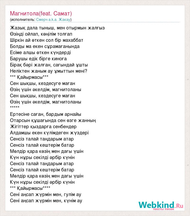 Жазық дала тыныш, мен отырмын жалғыз Өзіңді ойлап, көңілім толғап Шіркін ай өткен сол бір махаббат Болды ма екен сұрамағанында Есіме алшы өткен күндерді Барушы едік бірге киноға Бірақ бәрі жалған, сағындай ұшты Неліктен жаным ау ұмыттын мені? *** Қайырмасы*** Сен шықшы, кездесуге маған Өзің үшін әкелдім, магнитоланы Сен шықшы, кездесуге маған Өзің үшін әкелдім, магнитоланы ***** Ертесіне саған, бардым арнайы Отарсын құшағында сен өзге жанның Жігіттер қыздарға сенбендер Алдамшы екен күлімдеген жүздері Сенсіз талай таңдарым атар Сенсіз талай кештерім батар Мөлдір қара көзің мен дағы үшін Күн нұры секілді әрбір күнін Сенсіз талай таңдарым атар Сенсіз талай кештерім батар Мөлдір қара көзің мен дағы үшін Күн нұры секілді әрбір күнін *** Қайырмасы**** Сені аңсап жүрмін мен, гулім ау Сені аңсап жүрмін мен, күнім ау