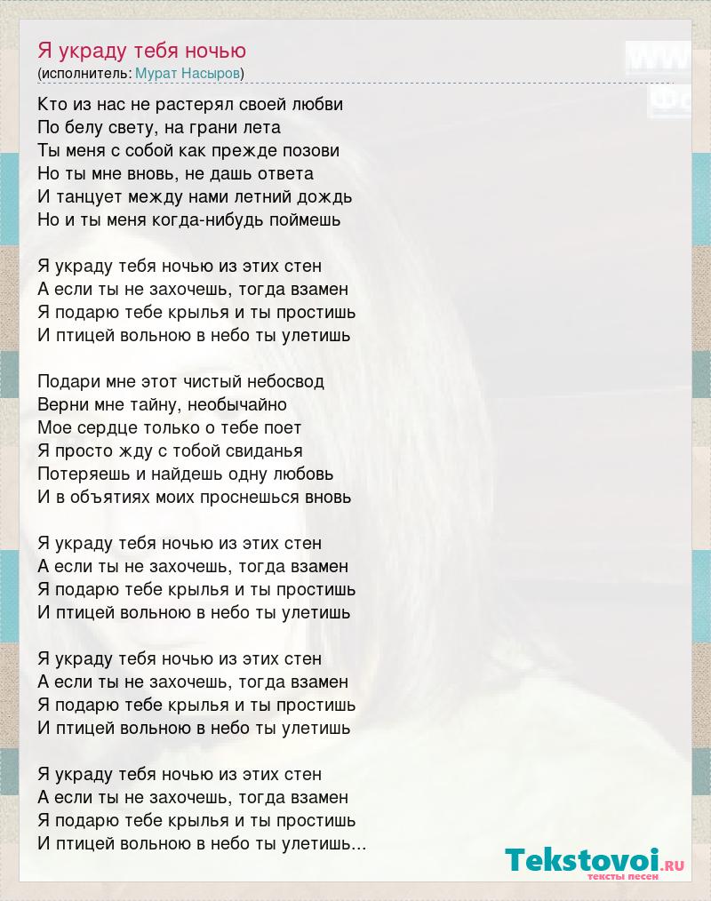 Кто из нас не растерял своей любви По белу свету, на грани лета Ты меня с собой как прежде позови Но ты мне вновь, не дашь ответа И танцует между нами летний дождь Но и ты меня когда-нибудь поймешь Я украду тебя ночью из этих стен А если ты не захочешь, тогда взамен Я подарю тебе крылья и ты простишь И птицей вольною в небо ты улетишь Подари мне этот чистый небосвод Верни мне тайну, необычайно Мое сердце только о тебе поет Я просто жду с тобой свиданья Потеряешь и найдешь одну любовь И в объятиях моих проснешься вновь Я украду тебя ночью из этих стен А если ты не захочешь, тогда взамен Я подарю тебе крылья и ты простишь И птицей вольною в небо ты улетишь Я украду тебя ночью из этих стен А если ты не захочешь, тогда взамен Я подарю тебе крылья и ты простишь И птицей вольною в небо ты улетишь Я украду тебя ночью из этих стен А если ты не захочешь, тогда взамен Я подарю тебе крылья и ты простишь И птицей вольною в небо ты улетишь...