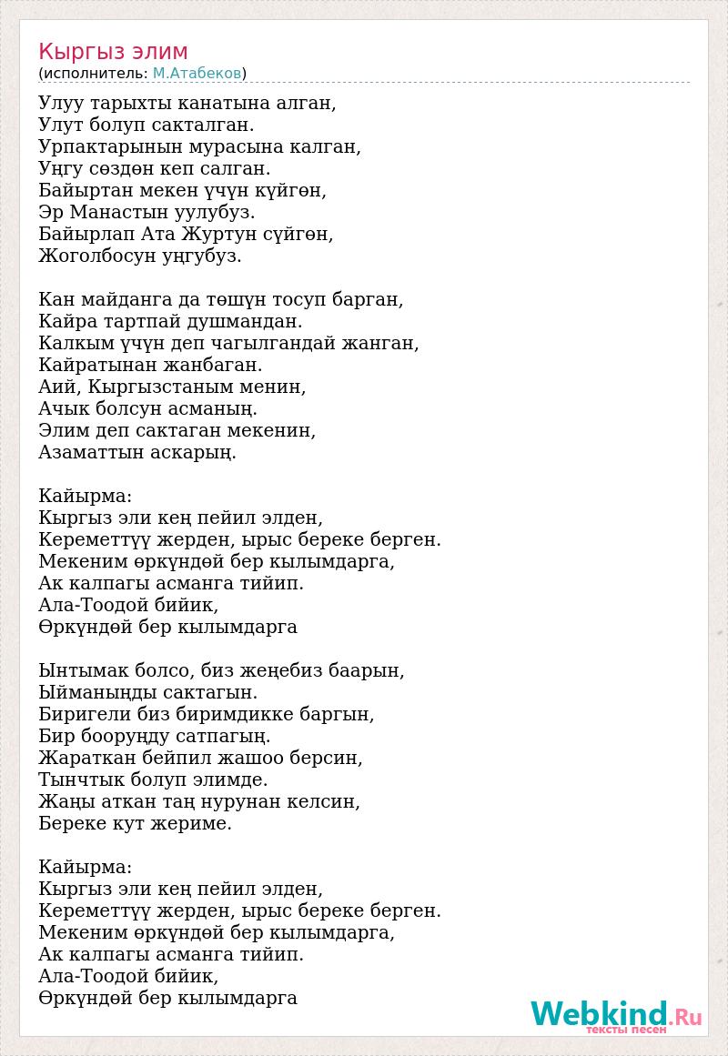 Улуу тарыхты канатына алган, Улут болуп сакталган. Урпактарынын мурасына калган, Уңгу сөздөн кеп салган. Байыртан мекен үчүн күйгөн, Эр Манастын уулубуз. Байырлап Ата Журтун сүйгөн, Жоголбосун уңгубуз. Кан майданга да төшүн тосуп барган, Кайра тартпай душмандан. Калкым үчүн деп чагылгандай жанган, Кайратынан жанбаган. Аий, Кыргызстаным менин, Ачык болсун асманың. Элим деп сактаган мекенин, Азаматтын аскарың. Кайырма: Кыргыз эли кең пейил элден, Кереметтүү жерден, ырыс береке берген. Мекеним өркүндөй бер кылымдарга, Ак калпагы асманга тийип. Ала-Тоодой бийик, Өркүндөй бер кылымдарга Ынтымак болсо, биз жеңебиз баарын, Ыйманыңды сактагын. Биригели биз биримдикке баргын, Бир бооруңду сатпагың. Жараткан бейпил жашоо берсин, Тынчтык болуп элимде. Жаңы аткан таң нурунан келсин, Береке кут жериме. Кайырма: Кыргыз эли кең пейил элден, Кереметтүү жерден, ырыс береке берген. Мекеним өркүндөй бер кылымдарга, Ак калпагы асманга тийип. Ала-Тоодой бийик, Өркүндөй бер кылымдарга