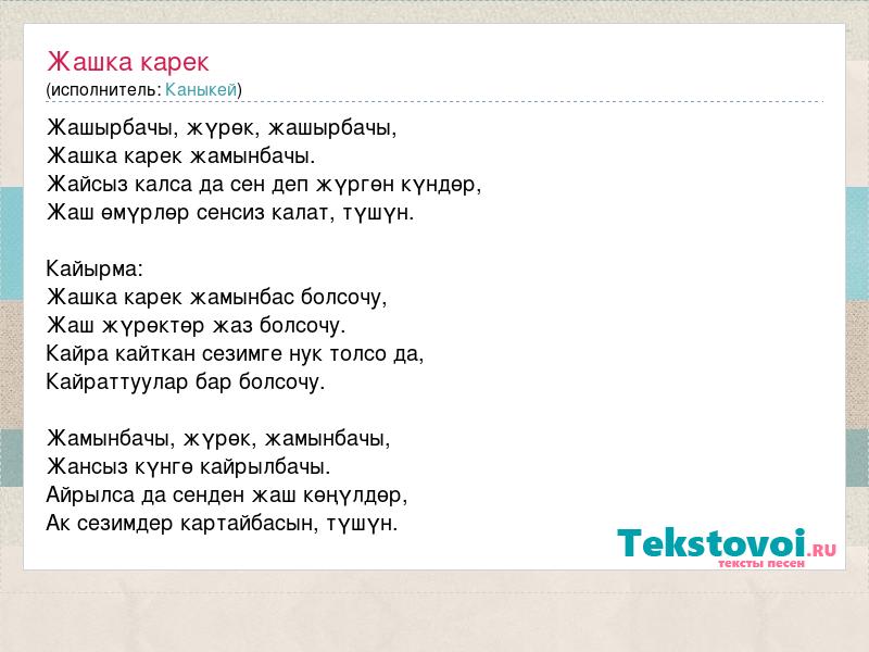 Жашырбачы, жүрөк, жашырбачы, Жашка карек жамынбачы. Жайсыз калса да сен деп жүргөн күндөр, Жаш өмүрлөр сенсиз калат, түшүн. Кайырма: Жашка карек жамынбас болсочу, Жаш жүрөктөр жаз болсочу. Кайра кайткан сезимге нук толсо да, Кайраттуулар бар болсочу. Жамынбачы, жүрөк, жамынбачы, Жансыз күнгө кайрылбачы. Айрылса да сенден жаш көңүлдөр, Ак сезимдер картайбасын, түшүн.