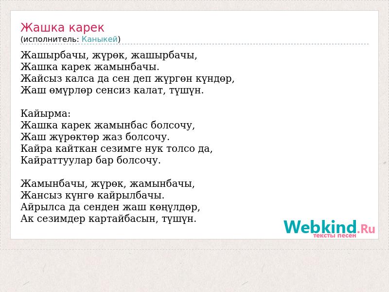 Жашырбачы, жүрөк, жашырбачы, Жашка карек жамынбачы. Жайсыз калса да сен деп жүргөн күндөр, Жаш өмүрлөр сенсиз калат, түшүн. Кайырма: Жашка карек жамынбас болсочу, Жаш жүрөктөр жаз болсочу. Кайра кайткан сезимге нук толсо да, Кайраттуулар бар болсочу. Жамынбачы, жүрөк, жамынбачы, Жансыз күнгө кайрылбачы. Айрылса да сенден жаш көңүлдөр, Ак сезимдер картайбасын, түшүн.