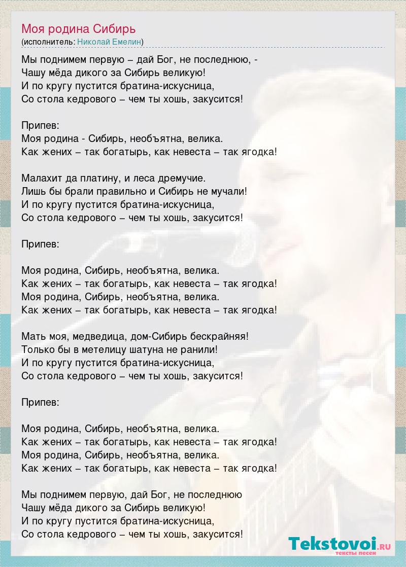 Мы поднимем первую − дай Бог, не последнюю, - Чашу мёда дикого за Сибирь великую! И по кругу пустится братина-искусница, Со стола кедрового − чем ты хошь, закусится! Припев: Моя родина - Сибирь, необъятна, велика. Как жених − так богатырь, как невеста − так ягодка! Малахит да платину, и леса дремучие. Лишь бы брали правильно и Сибирь не мучали! И по кругу пустится братина-искусница, Со стола кедрового − чем ты хошь, закусится! Припев: Моя родина, Сибирь, необъятна, велика. Как жених − так богатырь, как невеста − так ягодка! Моя родина, Сибирь, необъятна, велика. Как жених − так богатырь, как невеста − так ягодка! Мать моя, медведица, дом-Сибирь бескрайняя! Только бы в метелицу шатуна не ранили! И по кругу пустится братина-искусница, Со стола кедрового − чем ты хошь, закусится! Припев: Моя родина, Сибирь, необъятна, велика. Как жених − так богатырь, как невеста − так ягодка! Моя родина, Сибирь, необъятна, велика. Как жених − так богатырь, как невеста − так ягодка! Мы поднимем первую, дай Бог, не последнюю Чашу мёда дикого за Сибирь великую! И по кругу пустится братина-искусница, Со стола кедрового − чем ты хошь, закусится!
