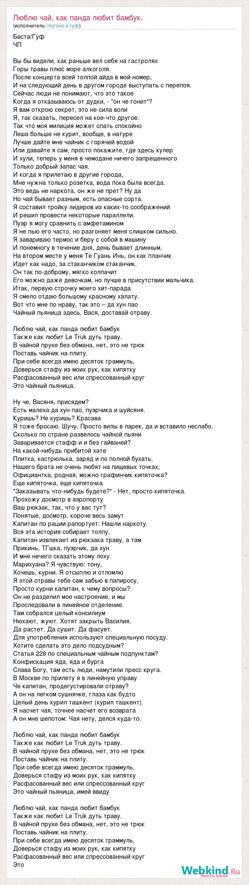 Баста/Гуф ЧП Вы бы видели, как раньше вел себя на гастролях Горы травы плюс море алкоголя. После концерта всей толпой айда в мой номер, И на следующий день в другом городе выступать с перепоя. Сейчас люди не понимают, что это такое Когда я отказываюсь от дудки, - "он че гонит"? Я вам открою секрет, это не сила воли Я, так сказать, пересел на кое-что другое. Так что моя милиция может спать спокойно Леша больше не курит, вообще, в натуре Лучше дайте мне чайник с горячей водой Или давайте я сам, просто покажите, где здесь кулер И хули, теперь у меня в чемодане ничего запрещенного Только добрый запас чая. И когда я прилетаю в другие города, Мне нужна только розетка, вода пока была всегда. Это ведь не наркота, он же не прет? Ну да Но чай бывает разным, есть опасные сорта. Я составил тройку лидеров из каких-то соображений И решил провести некоторые параллели. Пуэр я могу сравнить с амфетамином Я не пью его часто, но разгоняет меня слишком сильно. Я завариваю термос и беру с собой в машину И понемногу в течение дня, день бывает длинным. На втором месте у меня Те Гуань Инь, он как планчик Идет как надо, за стаканчиком стаканчик. Он так по-доброму, мягко колпачит Его можно даже девочкам, но лучше в присутствии мальчика. Итак, первую строчку моего хит-парада Я смело отдаю большому красному халату. Вот что мне по нраву, так это – да хун пао Чайный пьяница здесь, Вася, доставай отраву. Люблю чай, как панда любит бамбук Также как любит Le Truk дуть траву. В чайной прухе без обмана, нет, это не трюк Поставь чайник на плиту. При себе всегда имею десяток граммуль, Доверься стафу из моих рук, как кипятку Расфасованный вес или спрессованный круг Это чайный пьяница. Ну че, Васяня, присядем? Есть малеха да хун пао, пуэрчика и шуйсяня. Куришь? Не куришь? Красава Я тоже бросаю. Шучу. Просто вилы в ларек, да и вставило неслабо. Сколько по стране развелось чайной пьяни Заваривается стафф и и без гайваней? На какой-нибудь прибитой хате Плитка, кастрюлька, заряд и по полной бухать. Нашего брата не очень любят на пищевых точках, Официантка, родная, можно графинчик кипяточка? Еще кипяточка, еще кипяточка "Заказывать что-нибудь будете?" - Нет, просто кипяточка. Прохожу досмотр в аэропорту Ваш рюкзак, так, что у вас тут? Понятые, досмотр, короче весь замут Капитан по рации рапортует: Нашли наркоту. Вся эта история собирает толпу, Капитан извлекает из рюкзака траву, а там Прикинь, ТГшка, пуэрчик, да хун И мне нечего сказать этому лоху. Марихуана? Я чувствую: тону, Хочешь, курни. Я отсыплю и отломлю Я этой отравы тебе сам забью в папиросу, Просто курни капитан, к чему вопросы? Он не разделил мое настроение, и мы Проследовали в линейное отделение. Там собрался целый консилиум Нюхают, жуют. Хотят закрыть Василия. Да растет. Да сушит. Да фасует. Для употребления используют специальную посуду. Хотите сделать это дело подсудным? Статья 228 по специальным чайным подпунктам? Конфискация яда, яда и бурга Слава Богу, там есть люди, намутили пресс круга. В Москве по прилету я в линейную управу Че капитан, продегустировали отраву? А он на легком сушнячке, глаза как будто Целый день курил ташкент (курил ташкент). Я насчет чая, точнее насчет его возврата А он мне шепотом: Чая нету, делся куда-то. Люблю чай, как панда любит бамбук Также как любит Le Truk дуть траву. В чайной прухе без обмана, нет, это не трюк Поставь чайник на плиту. При 