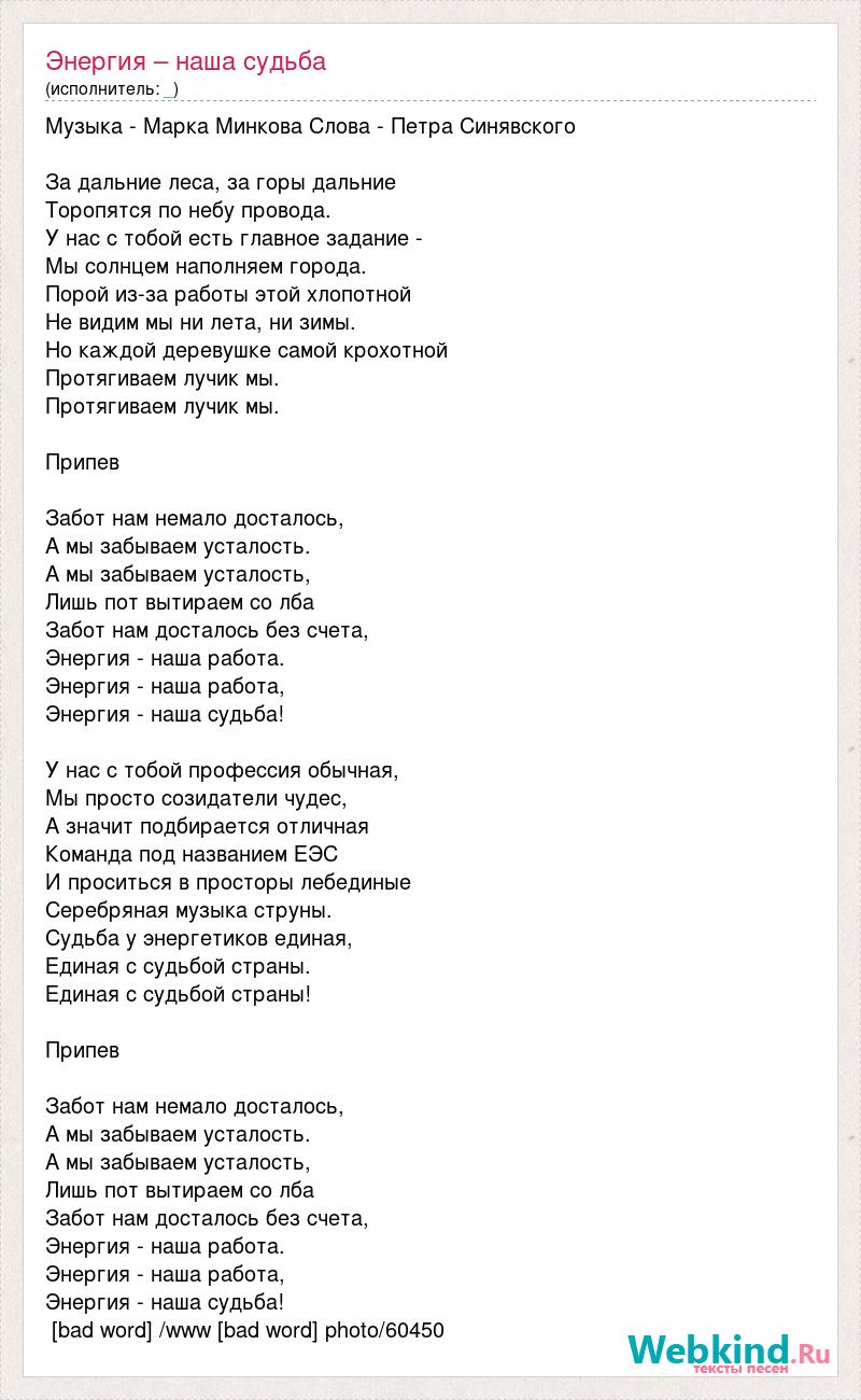 Музыка - Марка Минкова Слова - Петра Синявского За дальние леса, за горы дальние Торопятся по небу провода. У нас с тобой есть главное задание - Мы солнцем наполняем города. Порой из-за работы этой хлопотной Не видим мы ни лета, ни зимы. Но каждой деревушке самой крохотной Протягиваем лучик мы. Протягиваем лучик мы. Припев Забот нам немало досталось, А мы забываем усталость. А мы забываем усталость, Лишь пот вытираем со лба Забот нам досталось без счета, Энергия - наша работа. Энергия - наша работа, Энергия - наша судьба! У нас с тобой профессия обычная, Мы просто созидатели чудес, А значит подбирается отличная Команда под названием ЕЭС И проситься в просторы лебединые Серебряная музыка струны. Судьба у энергетиков единая, Единая с судьбой страны. Единая с судьбой страны! Припев Забот нам немало досталось, А мы забываем усталость. А мы забываем усталость, Лишь пот вытираем со лба Забот нам досталось без счета, Энергия - наша работа. Энергия - наша работа, Энергия - наша судьба! [bad word] /www [bad word] photo/60450