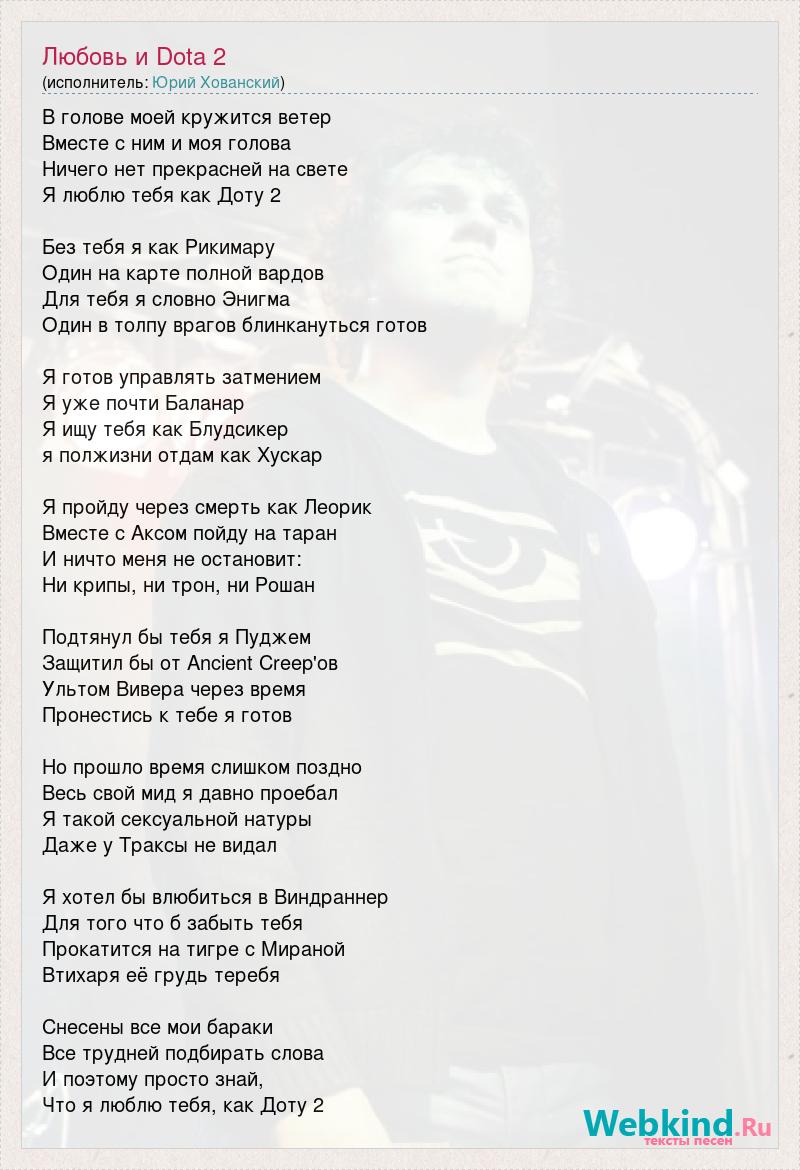 В голове моей кружится ветер Вместе с ним и моя голова Ничего нет прекрасней на свете Я люблю тебя как Доту 2 Без тебя я как Рикимару Один на карте полной вардов Для тебя я словно Энигма Один в толпу врагов блинкануться готов Я готов управлять затмением Я уже почти Баланар Я ищу тебя как Блудсикер я полжизни отдам как Хускар Я пройду через смерть как Леорик Вместе с Аксом пойду на таран И ничто меня не остановит: Ни крипы, ни трон, ни Рошан Подтянул бы тебя я Пуджем Защитил бы от Ancient Creep'ов Ультом Вивера через время Пронестись к тебе я готов Но прошло время слишком поздно Весь свой мид я давно проебал Я такой сексуальной натуры Даже у Траксы не видал Я хотел бы влюбиться в Виндраннер Для того что б забыть тебя Прокатится на тигре с Мираной Втихаря её грудь теребя Снесены все мои бараки Все трудней подбирать слова И поэтому просто знай, Что я люблю тебя, как Доту 2
