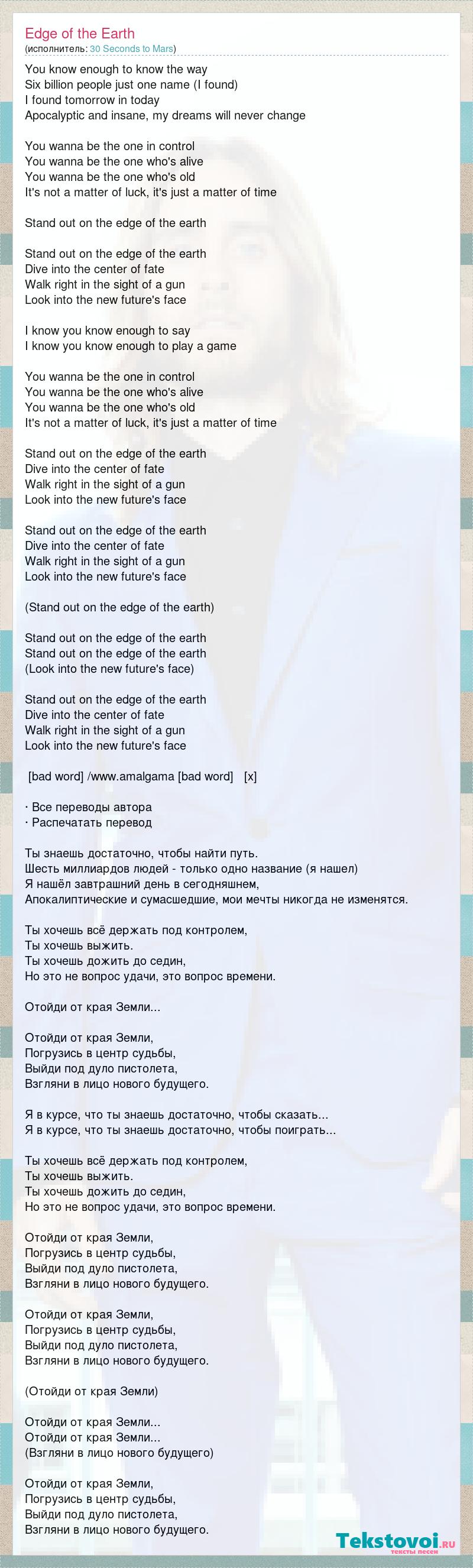You know enough to know the way Six billion people just one name (I found) I found tomorrow in today Apocalyptic and insane, my dreams will never change You wanna be the one in control You wanna be the one who's alive You wanna be the one who's old It's not a matter of luck, it's just a matter of time Stand out on the edge of the earth Stand out on the edge of the earth Dive into the center of fate Walk right in the sight of a gun Look into the new future's face I know you know enough to say I know you know enough to play a game You wanna be the one in control You wanna be the one who's alive You wanna be the one who's old It's not a matter of luck, it's just a matter of time Stand out on the edge of the earth Dive into the center of fate Walk right in the sight of a gun Look into the new future's face Stand out on the edge of the earth Dive into the center of fate Walk right in the sight of a gun Look into the new future's face (Stand out on the edge of the earth) Stand out on the edge of the earth Stand out on the edge of the earth (Look into the new future's face) Stand out on the edge of the earth Dive into the center of fate Walk right in the sight of a gun Look into the new future's face [bad word] /www.amalgama [bad word] [x] · Все переводы автора · Распечатать перевод Ты знаешь достаточно, чтобы найти путь. Шесть миллиардов людей - только одно название (я нашел) Я нашёл завтрашний день в сегодняшнем, Апокалиптические и сумасшедшие, мои мечты никогда не изменятся. Ты хочешь всё держать под контролем, Ты хочешь выжить. Ты хочешь дожить до седин, Но это не вопрос удачи, это вопрос времени. Отойди от края Земли... Отойди от края Земли, Погрузись в центр судьбы, Выйди под дуло пистолета, Взгляни в лицо нового будущего. Я в курсе, что ты знаешь достаточно, чтобы сказать... Я в курсе, что ты знаешь достаточно, чтобы поиграть... Ты хочешь всё держать под контролем, Ты хочешь выжить. Ты хочешь дожить до седин, Но это не вопрос удачи, это вопрос времени. Отойди от края Земли, Погрузись в центр судьбы, Выйди под дуло пистолета, Взгляни в лицо нового будущего. Отойди от края Земли, Погрузись в центр судьбы, Выйди под дуло пистолета, Взгляни в лицо нового будущего. (Отойди от края Земли) Отойди от края Земли... Отойди от края Земли... (Взгляни в лицо нового будущего) Отойди от края Земли, Погрузись в центр судьбы, Выйди под дуло пистолета, Взгляни в лицо нового будущего.