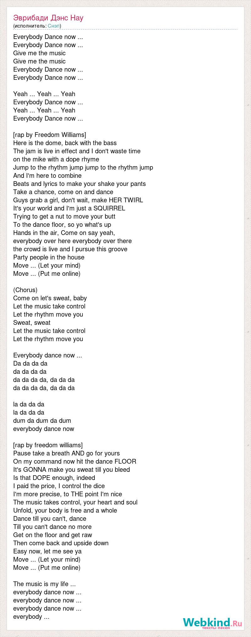 Everybody Dance now ... Everybody Dance now ... Give me the music Give me the music Everybody Dance now ... Everybody Dance now ... Yeah ... Yeah ... Yeah Everybody Dance now ... Yeah ... Yeah ... Yeah Everybody Dance now ... [rap by Freedom Williams] Here is the dome, back with the bass The jam is live in effect and I don't waste time on the mike with a dope rhyme Jump to the rhythm jump jump to the rhythm jump And I'm here to combine Beats and lyrics to make your shake your pants Take a chance, come on and dance Guys grab a girl, don't wait, make HER TWIRL It's your world and I'm just a SQUIRREL Trying to get a nut to move your butt To the dance floor, so yo what's up Hands in the air, Come on say yeah, everybody over here everybody over there the crowd is live and I pursue this groove Party people in the house Move ... (Let your mind) Move ... (Put me online) (Chorus) Come on let's sweat, baby Let the music take control Let the rhythm move you Sweat, sweat Let the music take control Let the rhythm move you Everybody dance now ... Da da da da da da da da da da da da, da da da da da da da, da da da la da da da la da da da dum da dum da dum everybody dance now [rap by freedom williams] Pause take a breath AND go for yours On my command now hit the dance FLOOR It's GONNA make you sweat till you bleed Is that DOPE enough, indeed I paid the price, I control the dice I'm more precise, to THE point I'm nice The music takes control, your heart and soul Unfold, your body is free and a whole Dance till you can't, dance Till you can't dance no more Get on the floor and get raw Then come back and upside down Easy now, let me see ya Move ... (Let your mind) Move ... (Put me online) The music is my life ... everybody dance now ... everybody dance now ... everybody dance now ... everybody ...