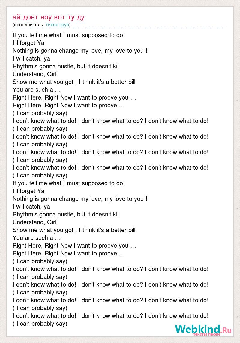 If you tell me what I must supposed to do! I’ll forget Ya Nothing is gonna change my love, my love to you ! I will catch, ya Rhythm’s gonna hustle, but it doesn’t kill Understand, Girl Show me what you got , I think it’s a better pill You are such a … Right Here, Right Now I want to proove you … Right Here, Right Now I want to proove … ( I can probably say) I don’t know what to do! I don’t know what to do? I don’t know what to do! ( I can probably say) I don’t know what to do! I don’t know what to do? I don’t know what to do! ( I can probably say) I don’t know what to do! I don’t know what to do? I don’t know what to do! ( I can probably say) I don’t know what to do! I don’t know what to do? I don’t know what to do! ( I can probably say) If you tell me what I must supposed to do! I’ll forget Ya Nothing is gonna change my love, my love to you ! I will catch, ya Rhythm’s gonna hustle, but it doesn’t kill Understand, Girl Show me what you got , I think it’s a better pill You are such a … Right Here, Right Now I want to proove you … Right Here, Right Now I want to proove … ( I can probably say) I don’t know what to do! I don’t know what to do? I don’t know what to do! ( I can probably say) I don’t know what to do! I don’t know what to do? I don’t know what to do! ( I can probably say) I don’t know what to do! I don’t know what to do? I don’t know what to do! ( I can probably say) I don’t know what to do! I don’t know what to do? I don’t know what to do! ( I can probably say)