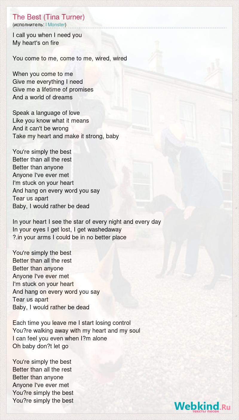 I call you when I need you My heart's on fire You come to me, come to me, wired, wired When you come to me Give me everything I need Give me a lifetime of promises And a world of dreams Speak a language of love Like you know what it means And it can't be wrong Take my heart and make it strong, baby You're simply the best Better than all the rest Better than anyone Anyone I've ever met I'm stuck on your heart And hang on every word you say Tear us apart Baby, I would rather be dead In your heart I see the star of every night and every day In your eyes I get lost, I get washedaway ?.in your arms I could be in no better place You're simply the best Better than all the rest Better than anyone Anyone I've ever met I'm stuck on your heart And hang on every word you say Tear us apart Baby, I would rather be dead Each time you leave me I start losing control You?re walking away with my heart and my soul I can feel you even when I?m alone Oh baby don?t let go You're simply the best Better than all the rest Better than anyone Anyone I've ever met You?re simply the best You?re simply the best