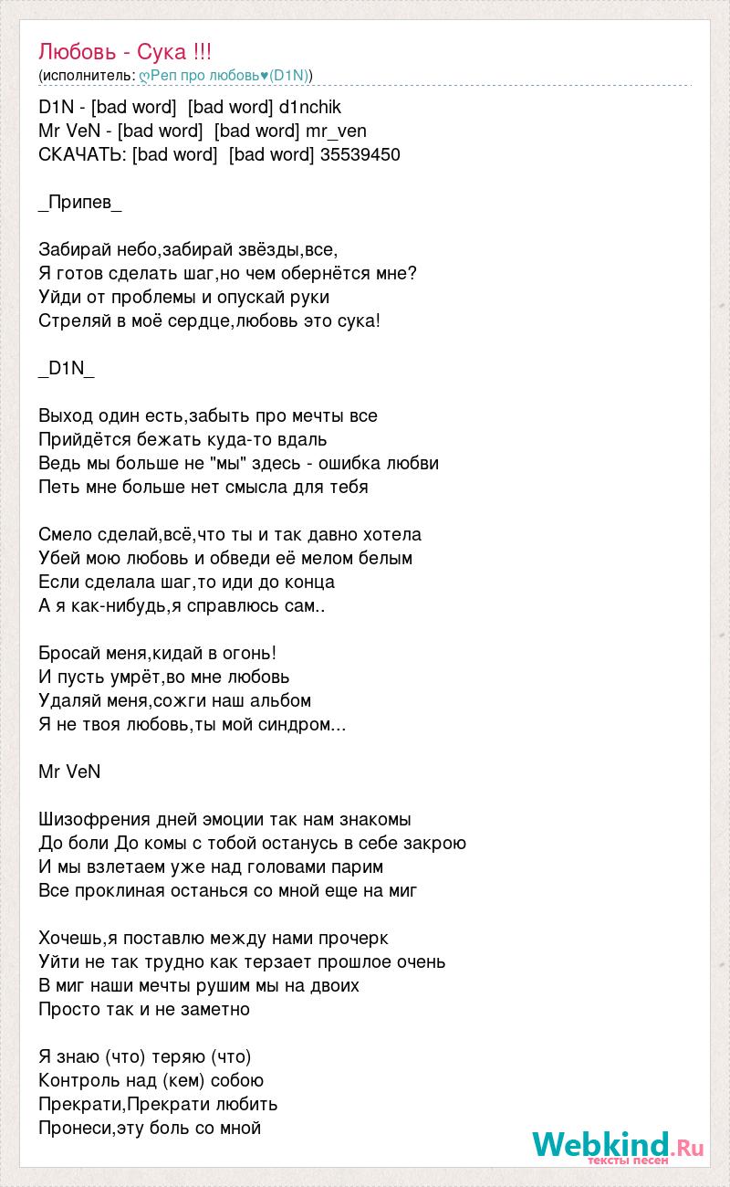 D1N - [bad word] [bad word] d1nchik Mr VeN - [bad word] [bad word] mr_ven СКАЧАТЬ: [bad word] [bad word] 35539450 _Припев_ Забирай небо,забирай звёзды,все, Я готов сделать шаг,но чем обернётся мне? Уйди от проблемы и опускай руки Стреляй в моё сердце,любовь это сука! _D1N_ Выход один есть,забыть про мечты все Прийдётся бежать куда-то вдаль Ведь мы больше не "мы" здесь - ошибка любви Петь мне больше нет смысла для тебя Смело сделай,всё,что ты и так давно хотела Убей мою любовь и обведи её мелом белым Если сделала шаг,то иди до конца А я как-нибудь,я справлюсь сам.. Бросай меня,кидай в огонь! И пусть умрёт,во мне любовь Удаляй меня,сожги наш альбом Я не твоя любовь,ты мой синдром... Mr VeN Шизофрения дней эмоции так нам знакомы До боли До комы с тобой останусь в себе закрою И мы взлетаем уже над головами парим Все проклиная останься со мной еще на миг Хочешь,я поставлю между нами прочерк Уйти не так трудно как терзает прошлое очень В миг наши мечты рушим мы на двоих Просто так и не заметно Я знаю (что) теряю (что) Контроль над (кем) собою Прекрати,Прекрати любить Пронеси,эту боль со мной