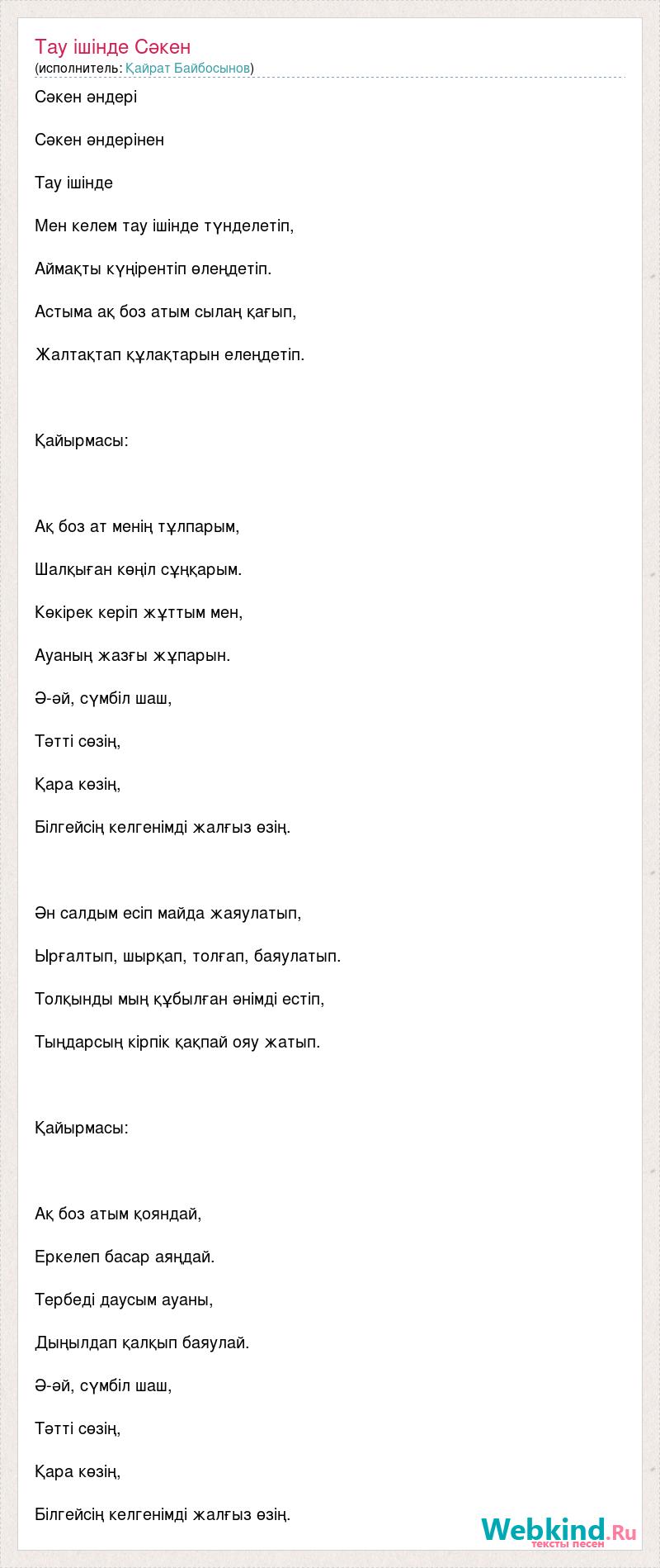 Сәкен әндері Сәкен әндерінен Тау ішінде Мен келем тау ішінде түнделетіп, Аймақты күңірентіп өлеңдетіп. Астыма ақ боз атым сылаң қағып, Жалтақтап құлақтарын елеңдетіп. Қайырмасы: Ақ боз ат менің тұлпарым, Шалқыған көңіл сұңқарым. Көкірек керіп жұттым мен, Ауаның жазғы жұпарын. Ә-әй, сүмбіл шаш, Тәтті сөзің, Қара көзің, Білгейсің келгенімді жалғыз өзің. Ән салдым есіп майда жаяулатып, Ырғалтып, шырқап, толғап, баяулатып. Толқынды мың құбылған әнімді естіп, Тыңдарсың кірпік қақпай ояу жатып. Қайырмасы: Ақ боз атым қояндай, Еркелеп басар аяңдай. Тербеді даусым ауаны, Дыңылдап қалқып баяулай. Ә-әй, сүмбіл шаш, Тәтті сөзің, Қара көзің, Білгейсің келгенімді жалғыз өзің.