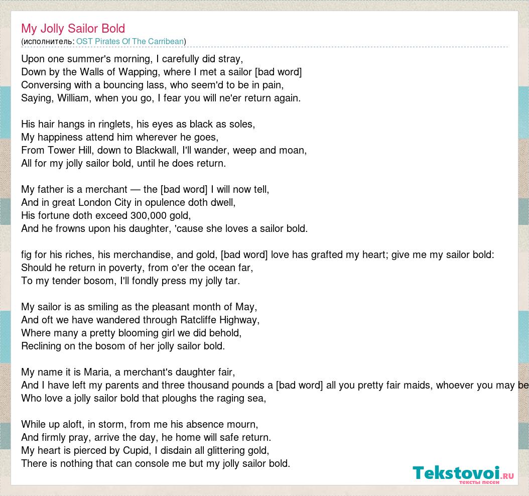 Upon one summer's morning, I carefully did stray, Down by the Walls of Wapping, where I met a sailor [bad word] Conversing with a bouncing lass, who seem'd to be in pain, Saying, William, when you go, I fear you will ne'er return again. His hair hangs in ringlets, his eyes as black as soles, My happiness attend him wherever he goes, From Tower Hill, down to Blackwall, I'll wander, weep and moan, All for my jolly sailor bold, until he does return. My father is a merchant — the truth I will now tell, And in great London City in opulence doth dwell, His fortune doth exceed 300,000 gold, And he frowns upon his daughter, 'cause she loves a sailor bold. fig for his riches, his merchandise, and gold, True love has grafted my heart; give me my sailor bold: Should he return in poverty, from o'er the ocean far, To my tender bosom, I'll fondly press my jolly tar. My sailor is as smiling as the pleasant month of May, And oft we have wandered through Ratcliffe Highway, Where many a pretty blooming girl we did behold, Reclining on the bosom of her jolly sailor bold. My name it is Maria, a merchant's daughter fair, And I have left my parents and three thousand pounds a year, Come all you pretty fair maids, whoever you may be Who love a jolly sailor bold that ploughs the raging sea, While up aloft, in storm, from me his absence mourn, And firmly pray, arrive the day, he home will safe return. My heart is pierced by Cupid, I disdain all glittering gold, There is nothing that can console me but my jolly sailor bold.
