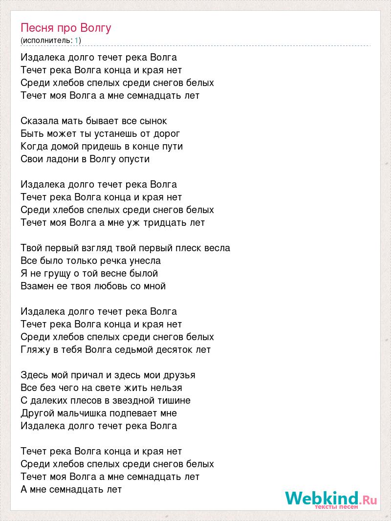 Издалека долго течет река Волга Течет река Волга конца и края нет Среди хлебов спелых среди снегов белых Течет моя Волга а мне семнадцать лет Сказала мать бывает все сынок Быть может ты устанешь от дорог Когда домой придешь в конце пути Свои ладони в Волгу опусти Издалека долго течет река Волга Течет река Волга конца и края нет Среди хлебов спелых среди снегов белых Течет моя Волга а мне уж тридцать лет Твой первый взгляд твой первый плеск весла Все было только речка унесла Я не грущу о той весне былой Взамен ее твоя любовь со мной Издалека долго течет река Волга Течет река Волга конца и края нет Среди хлебов спелых среди снегов белых Гляжу в тебя Волга седьмой десяток лет Здесь мой причал и здесь мои друзья Все без чего на свете жить нельзя С далеких плесов в звездной тишине Другой мальчишка подпевает мне Издалека долго течет река Волга Течет река Волга конца и края нет Среди хлебов спелых среди снегов белых Течет моя Волга а мне семнадцать лет А мне семнадцать лет