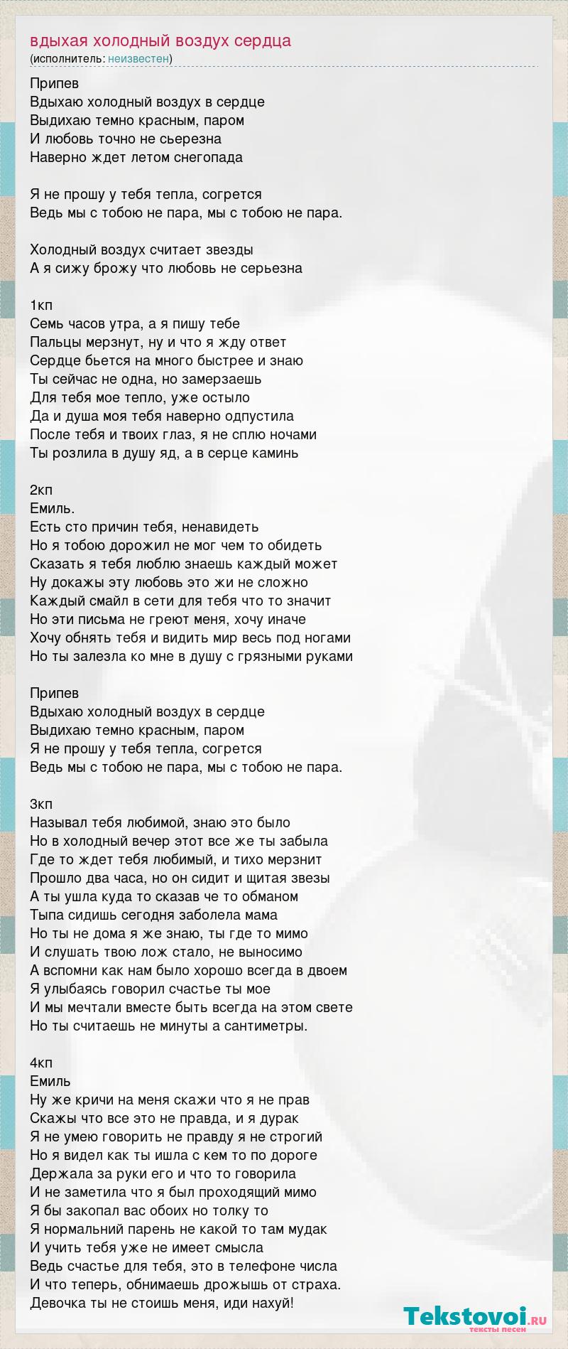 Припев Вдыхаю холодный воздух в сердце Выдихаю темно красным, паром И любовь точно не сьерезна Наверно ждет летом снегопада Я не прошу у тебя тепла, согрется Ведь мы с тобою не пара, мы с тобою не пара. Холодный воздух считает звезды А я сижу брожу что любовь не серьезна 1кп Семь часов утра, а я пишу тебе Пальцы мерзнут, ну и что я жду ответ Сердце бьется на много быстрее и знаю Ты сейчас не одна, но замерзаешь Для тебя мое тепло, уже остыло Да и душа моя тебя наверно одпустила После тебя и твоих глаз, я не сплю ночами Ты розлила в душу яд, а в серце каминь 2кп Емиль. Есть сто причин тебя, ненавидеть Но я тобою дорожил не мог чем то обидеть Сказать я тебя люблю знаешь каждый может Ну докажы эту любовь это жи не сложно Каждый смайл в сети для тебя что то значит Но эти письма не греют меня, хочу иначе Хочу обнять тебя и видить мир весь под ногами Но ты залезла ко мне в душу с грязными руками Припев Вдыхаю холодный воздух в сердце Выдихаю темно красным, паром Я не прошу у тебя тепла, согрется Ведь мы с тобою не пара, мы с тобою не пара. 3кп Называл тебя любимой, знаю это было Но в холодный вечер этот все же ты забыла Где то ждет тебя любимый, и тихо мерзнит Прошло два часа, но он сидит и щитая звезы А ты ушла куда то сказав че то обманом Тыпа сидишь сегодня заболела мама Но ты не дома я же знаю, ты где то мимо И слушать твою лож стало, не выносимо А вспомни как нам было хорошо всегда в двоем Я улыбаясь говорил счастье ты мое И мы мечтали вместе быть всегда на этом свете Но ты считаешь не минуты а сантиметры. 4кп Емиль Ну же кричи на меня скажи что я не прав Скажы что все это не правда, и я дурак Я не умею говорить не правду я не строгий Но я видел как ты ишла с кем то по дороге Держала за руки его и что то говорила И не заметила что я был проходящий мимо Я бы закопал вас обоих но толку то Я нормальний парень не какой то там мудак И учить тебя уже не имеет смысла Ведь счастье для тебя, это в телефоне числа И что теперь, обнимаешь дрожышь от страха. Девочка ты не стоишь меня, иди нахуй!