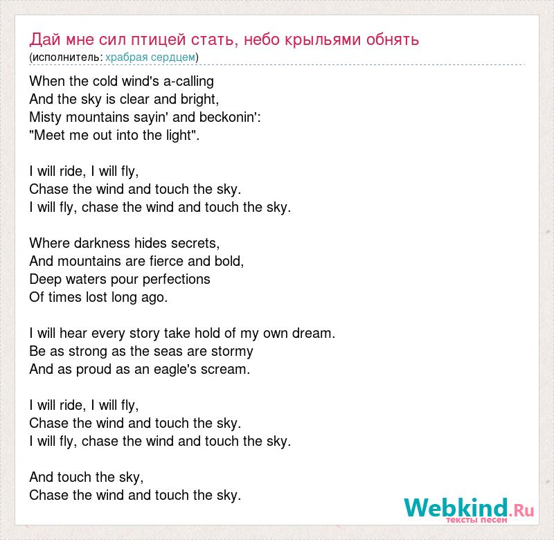 When the cold wind's a-calling And the sky is clear and bright, Misty mountains sayin' and beckonin': "Meet me out into the light". I will ride, I will fly, Chase the wind and touch the sky. I will fly, chase the wind and touch the sky. Where darkness hides secrets, And mountains are fierce and bold, Deep waters pour perfections Of times lost long ago. I will hear every story take hold of my own dream. Be as strong as the seas are stormy And as proud as an eagle's scream. I will ride, I will fly, Chase the wind and touch the sky. I will fly, chase the wind and touch the sky. And touch the sky, Chase the wind and touch the sky.