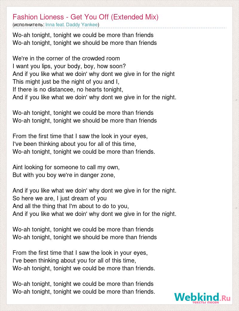 Wo-ah tonight, tonight we could be more than friends Wo-ah tonight, tonight we should be more than friends We're in the corner of the crowded room I want you lips, your body, boy, how soon? And if you like what we doin' why dont we give in for the night This might just be the night of you and I, If there is no distancee, no hearts tonight, And if you like what we doin' why dont we give in for the night. Wo-ah tonight, tonight we could be more than friends Wo-ah tonight, tonight we should be more than friends From the first time that I saw the look in your eyes, I've been thinking about you for all of this time, Wo-ah tonight, tonight we could be more than friends. Aint looking for someone to call my own, But with you boy we're in danger zone, And if you like what we doin' why dont we give in for the night. So here we are, I just dream of you And all the thing that I'm about to do to you, And if you like what we doin' why dont we give in for the night. Wo-ah tonight, tonight we could be more than friends Wo-ah tonight, tonight we should be more than friends From the first time that I saw the look in your eyes, I've been thinking about you for all of this time, Wo-ah tonight, tonight we could be more than friends. Wo-ah tonight, tonight we could be more than friends Wo-ah tonight, tonight we could be more than friends.