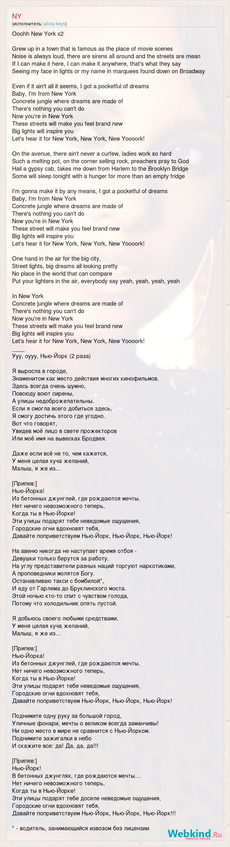 Ooohh New York x2 Grew up in a town that is famous as the place of movie scenes Noise is always loud, there are sirens all around and the streets are mean If I can make it here, I can make it anywhere, that's what they say Seeing my face in lights or my name in marquees found down on Broadway Even if it ain't all it seems, I got a pocketful of dreams Baby, I'm from New York Concrete jungle where dreams are made of There's nothing you can't do Now you're in New York These streets will make you feel brand new Big lights will inspire you Let's hear it for New York, New York, New Yoooork! On the avenue, there ain't never a curfew, ladies work so hard Such a melting pot, on the corner selling rock, preachers pray to God Hail a gypsy cab, takes me down from Harlem to the Brooklyn Bridge Some will sleep tonight with a hunger for more than an empty fridge I'm gonna make it by any means, I got a pocketful of dreams Baby, I'm from New York Concrete jungle where dreams are made of There's nothing you can't do Now you're in New York These street will make you feel brand new Big lights will inspire you Let's hear it for New York, New York, New Yoooork! One hand in the air for the big city, Street lights, big dreams all looking pretty No place in the world that can compare Put your lighters in the air, everybody say yeah, yeah, yeah, yeah In New York Concrete jungle where dreams are made of There's nothing you can't do Now you're in New York These streets will make you feel brand new Big lights will inspire you Let's hear it for New York, New York, New Yoooork! ____ Ууу, оууу, Нью-Йорк (2 раза) Я выросла в городе, Знаменитом как место действия многих кинофильмов. Здесь всегда очень шумно, Повсюду воют сирены, А улицы недоброжелательны. Если я смогла всего добиться здесь, Я смогу достичь этого где угодно. Вот что говорят, Увидев моё лицо в свете прожекторов Или моё имя на вывесках Бродвея. Даже если всё не то, чем кажется, У меня целая куча желаний, Малыш, я же из... [Припев:] Нью-Йорка! Из бетонных джунглей, где рождаются мечты. Нет ничего невозможного теперь, Когда ты в Нью-Йорке! Эти улицы подарят тебе неведомые ощущения, Городские огни вдохновят тебя, Давайте поприветствуем Нью-Йорк, Нью-Йорк, Нью-Йорк! На авеню никогда не наступает время отбоя - Девушки только берутся за работу. На углу представители разных наций торгуют наркотиками, А проповедники молятся Богу. Останавливаю такси с бомбилой*, И еду от Гарлема до Бруклинского моста. Этой ночью кто-то спит с чувством голода, Потому что холодильник опять пустой. Я добьюсь своего любыми средствами, У меня целая куча желаний, Малыш, я же из... [Припев:] Нью-Йорка! Из бетонных джунглей, где рождаются мечты. Нет ничего невозможного теперь, Когда ты в Нью-Йорке! Эти улицы подарят тебе неведомые ощущения, Городские огни вдохновят тебя, Давайте поприветствуем Нью-Йорк, Нью-Йорк, Нью-Йорк! Поднимите одну руку за большой город, Уличные фонари, мечты о великом всегда заманчивы! Ни одно место в мире не сравнится с Нью-Йорком. Поднимите зажигалки в небо И скажите все: да! Да, да, да!!! [Припев:] Нью-Йорк! В бетонных джунглях, где рождаются мечты… Нет ничего невозможного теперь, Когда ты в Нью-Йорке! Эти улицы подарят тебе доселе неведомые ощущения, Городские огни вдохновят тебя, Давайте поприветствуем Нью-Йорк, Нью-Йорк, Нью-Йорк!!! * - водитель, занимающийся извозом без лицензии