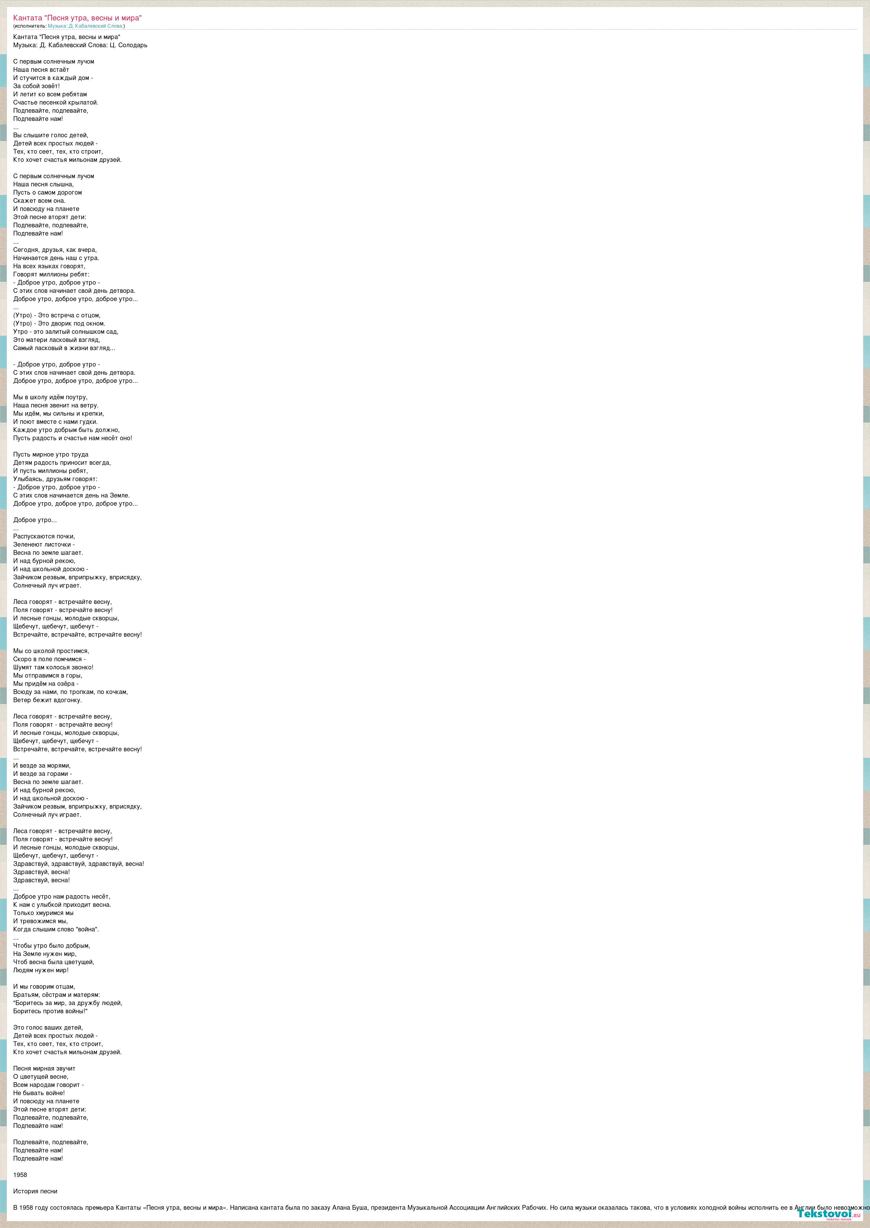 Кантата "Песня утра, весны и мира" Музыка: Д. Кабалевский Слова: Ц. Солодарь С первым солнечным лучом Наша песня встаёт И стучится в каждый дом - За собой зовёт! И летит ко всем ребятам Счастье песенкой крылатой. Подпевайте, подпевайте, Подпевайте нам! ... Вы слышите голос детей, Детей всех простых людей - Тех, кто сеет, тех, кто строит, Кто хочет счастья мильонам друзей. С первым солнечным лучом Наша песня слышна, Пусть о самом дорогом Скажет всем она. И повсюду на планете Этой песне вторят дети: Подпевайте, подпевайте, Подпевайте нам! ... Сегодня, друзья, как вчера, Начинается день наш с утра. На всех языках говорят, Говорят миллионы ребят: - Доброе утро, доброе утро - С этих слов начинает свой день детвора. Доброе утро, доброе утро, доброе утро... ... (Утро) - Это встреча с отцом, (Утро) - Это дворик под окном. Утро - это залитый солнышком сад, Это матери ласковый взгляд, Самый ласковый в жизни взгляд... - Доброе утро, доброе утро - С этих слов начинает свой день детвора. Доброе утро, доброе утро, доброе утро... Мы в школу идём поутру, Наша песня звенит на ветру. Мы идём, мы сильны и крепки, И поют вместе с нами гудки. Каждое утро добрым быть должно, Пусть радость и счастье нам несёт оно! Пусть мирное утро труда Детям радость приносит всегда, И пусть миллионы ребят, Улыбаясь, друзьям говорят: - Доброе утро, доброе утро - С этих слов начинается день на Земле. Доброе утро, доброе утро, доброе утро... Доброе утро... ... Распускаются почки, Зеленеют листочки - Весна по земле шагает. И над бурной рекою, И над школьной доскою - Зайчиком резвым, вприпрыжку, вприсядку, Солнечный луч играет. Леса говорят - встречайте весну, Поля говорят - встречайте весну! И лесные гонцы, молодые скворцы, Щебечут, щебечут, щебечут - Встречайте, встречайте, встречайте весну! Мы со школой простимся, Скоро в поле помчимся - Шумят там колосья звонко! Мы отправимся в горы, Мы придём на озёра - Всюду за нами, по тропкам, по кочкам, Ветер бежит вдогонку. Леса говорят - встречайте весну, Поля говорят - встречайте весну! И лесные гонцы, молодые скворцы, Щебечут, щебечут, щебечут - Встречайте, встречайте, встречайте весну! ... И везде за морями, И везде за горами - Весна по земле шагает. И над бурной рекою, И над школьной доскою - Зайчиком резвым, вприпрыжку, вприсядку, Солнечный луч играет. Леса говорят - встречайте весну, Поля говорят - встречайте весну! И лесные гонцы, молодые скворцы, Щебечут, щебечут, щебечут - Здравствуй, здравствуй, здравствуй, весна! Здравствуй, весна! Здравствуй, весна! ... Доброе утро нам радость несёт, К нам с улыбкой приходит весна. Только хмуримся мы И тревожимся мы, Когда слышим слово "война". ... Чтобы утро было добрым, На Земле нужен мир, Чтоб весна была цветущей, Людям нужен мир! И мы говорим отцам, Братьям, сёстрам и матерям: "Боритесь за мир, за дружбу людей, Боритесь против войны!" Это голос ваших детей, Детей всех простых людей - Тех, кто сеет, тех, кто строит, Кто хочет счастья мильонам друзей. Песня мирная звучит О цветущей весне, Всем народам говорит - Не бывать войне! И повсюду на планете Этой песне вторят дети: Подпевайте, подпевайте, Подпевайте нам! Подпевайте, подпевайте, Подпевайте нам! Подпевайте нам! 1958 История песни В 1958 году состоялась премьера Кантаты «Песня утра, весны и мира». Написана кантата была по заказу Алана Буша, президента Музыкальной Ассоциации Английских Рабочих. Но сила музыки оказала