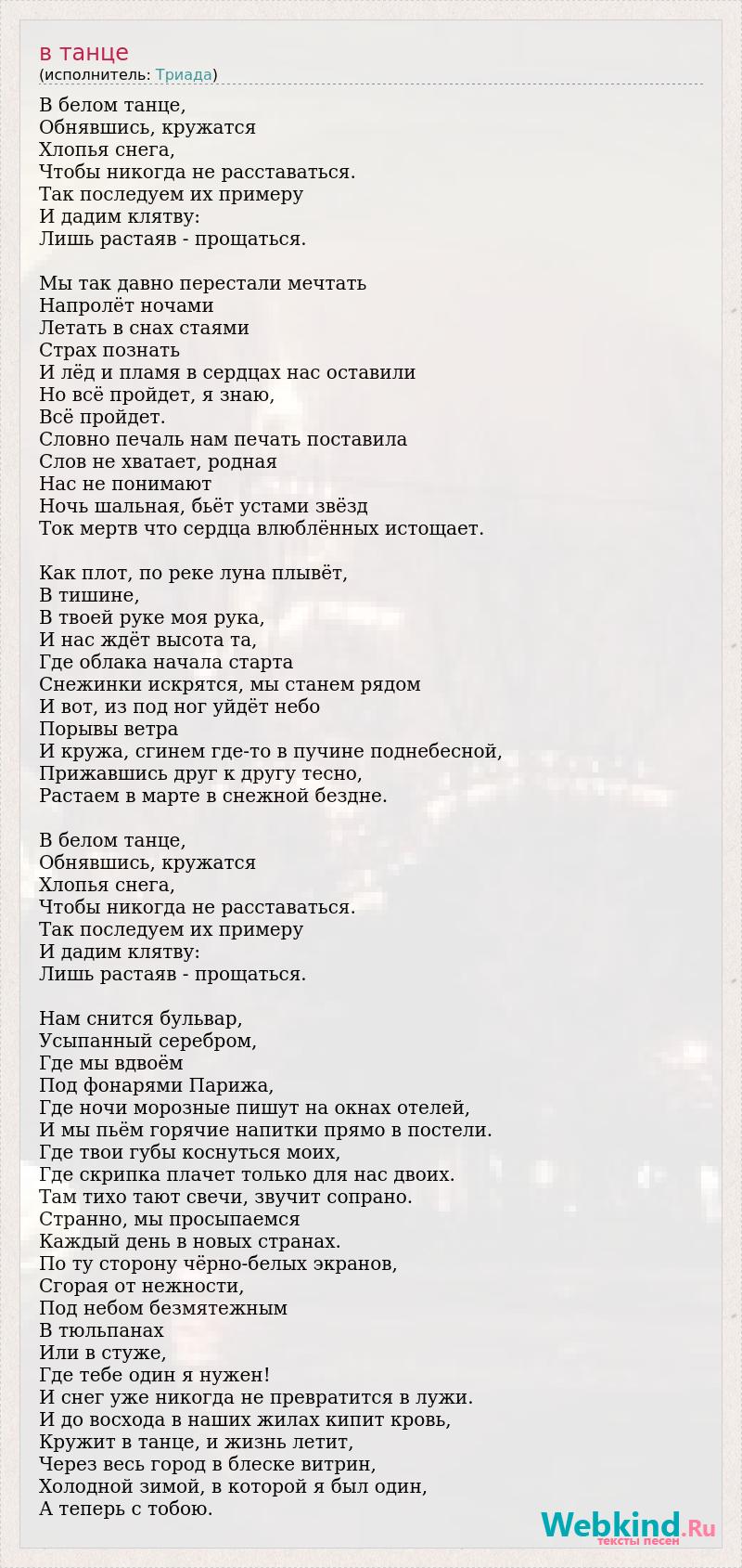 В белом танце, Обнявшись, кружатся Хлопья снега, Чтобы никогда не расставаться. Так последуем их примеру И дадим клятву: Лишь растаяв - прощаться. Мы так давно перестали мечтать Напролёт ночами Летать в снах стаями Страх познать И лёд и пламя в сердцах нас оставили Но всё пройдет, я знаю, Всё пройдет. Словно печаль нам печать поставила Слов не хватает, родная Нас не понимают Ночь шальная, бьёт устами звёзд Ток мертв что сердца влюблённых истощает. Как плот, по реке луна плывёт, В тишине, В твоей руке моя рука, И нас ждёт высота та, Где облака начала старта Снежинки искрятся, мы станем рядом И вот, из под ног уйдёт небо Порывы ветра И кружа, сгинем где-то в пучине поднебесной, Прижавшись друг к другу тесно, Растаем в марте в снежной бездне. В белом танце, Обнявшись, кружатся Хлопья снега, Чтобы никогда не расставаться. Так последуем их примеру И дадим клятву: Лишь растаяв - прощаться. Нам снится бульвар, Усыпанный серебром, Где мы вдвоём Под фонарями Парижа, Где ночи морозные пишут на окнах отелей, И мы пьём горячие напитки прямо в постели. Где твои губы коснуться моих, Где скрипка плачет только для нас двоих. Там тихо тают свечи, звучит сопрано. Странно, мы просыпаемся Каждый день в новых странах. По ту сторону чёрно-белых экранов, Сгорая от нежности, Под небом безмятежным В тюльпанах Или в стуже, Где тебе один я нужен! И снег уже никогда не превратится в лужи. И до восхода в наших жилах кипит кровь, Кружит в танце, и жизнь летит, Через весь город в блеске витрин, Холодной зимой, в которой я был один, А теперь с тобою.