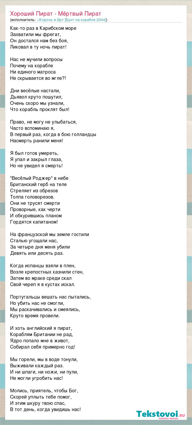 Как-то раз в Карибском море Захватили мы фрегат, Он достался нам без боя, Ликовал в ту ночь пират! Нас не мучили вопросы Почему на корабле Ни единого матроса Не скрывается во мгле?! Дни весёлые настали, Дьявол круто пошутил, Очень скоро мы узнали, Что корабль проклят был! Право, не могу не улыбаться, Часто вспоминаю я, В первый раз, когда в бою голландцы Насмерть ранили меня! Я был готов умереть, Я упал и закрыл глаза, Но не увидел я смерть! "Весёлый Роджер" в небе Британский герб на теле Стреляет из обрезов Толпа головорезов. Они не трусят смерти Проворные, как черти И обкурившись планом Гордятся капитаном! На французской мы земле гостили Сталью угощали нас, За четыре дня меня убили Девять или десять раз. Когда испанцы взяли в плен, Возле крепостных казнили стен, Затем во мраке среди скал Свой череп я в кустах искал. Португальцы вешать нас пытались, Но убить нас не смогли, Мы раскачивались и смеялись, Круто время провели. И хоть английский я пират, Кораблям Британии не рад, Ядро попало мне в живот, Собирал себя примерно год! Мы горели, мы в воде тонули, Выживали каждый раз. И ни шпаги, ни ножи, ни пули, Не могли угробить нас! Молись, приятель, чтобы Бог, Скорей уплыть тебе помог, И этим шкуру твою спас, В тот день, когда увидишь нас!